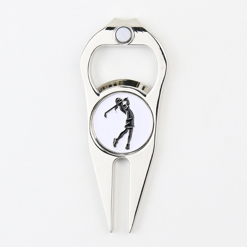 This sturdy metal tool fixes course greens, opens bottles, and includes a removable ball marker—all in one. Adorned with a female golfer design, it’s compact, practical, and stylish, ideal for on-course convenience or gifting to golf lovers.