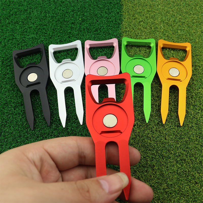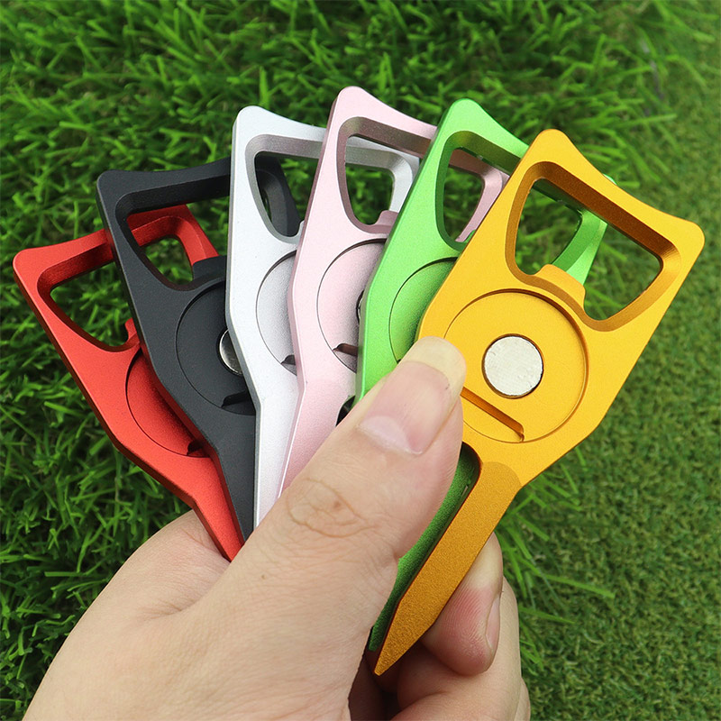 Crafted from sturdy aluminum, this tool repairs greens, opens bottles, and includes a magnetic flag ball marker. Available in vibrant hues (red, pink, etc.), it’s portable, practical, and perfect for on-course convenience or gifting to golf lovers.