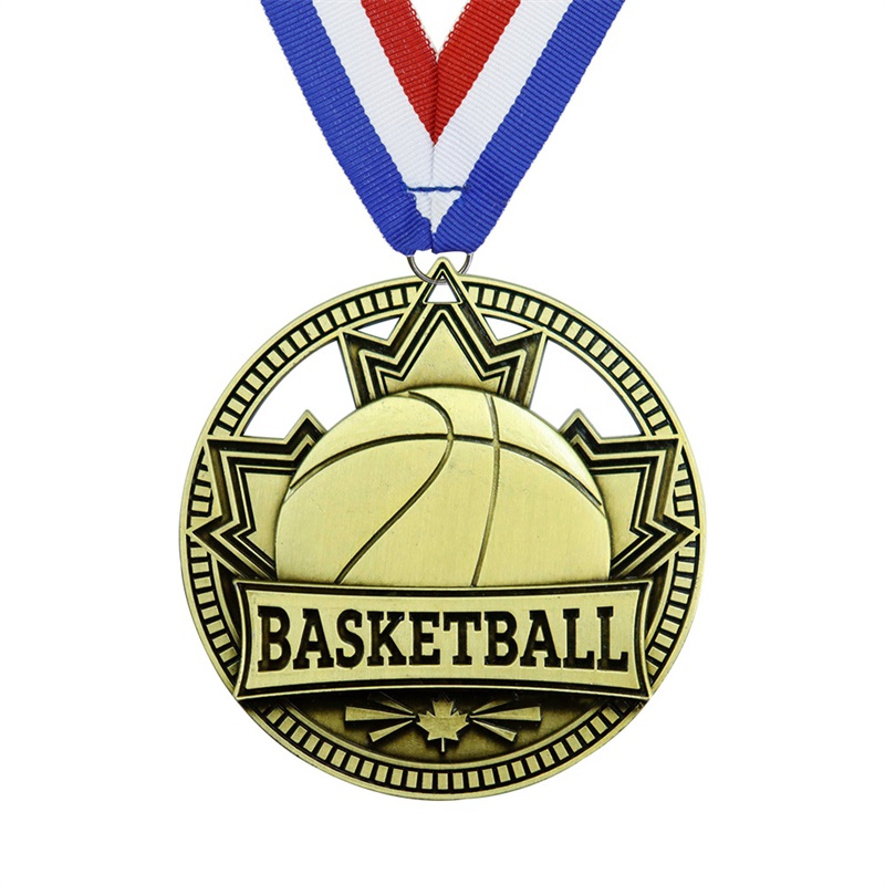 This antique gold/silver/red copper medal features a bold 3D basketball, star accents, and "BASKETBALL" lettering—echoing court energy. Ideal for youth leagues, school tournaments, or team MVPs, its durable metal build merges sport-specific flair with classic design for meaningful hoops honors.
