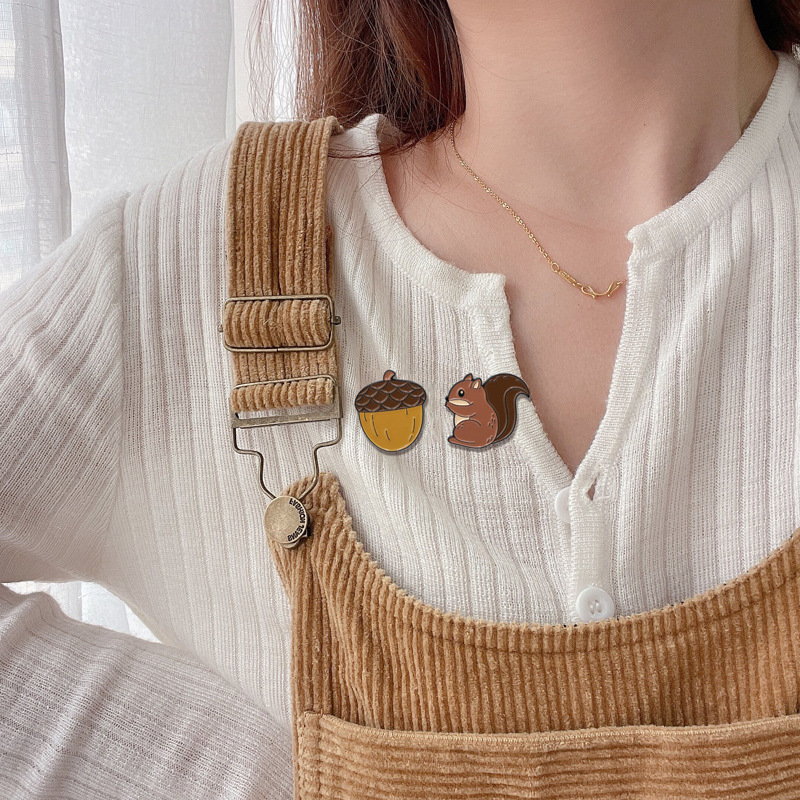 These matching pins have a rounded acorn shape and a compact squirrel silhouette, finished with soft, earthy-toned gloss. They adorn backpacks, lapels, or hats—perfect for nature lovers to pair (or split) as cute accents, adding whimsical forest charm to daily outfits or as a small gift.