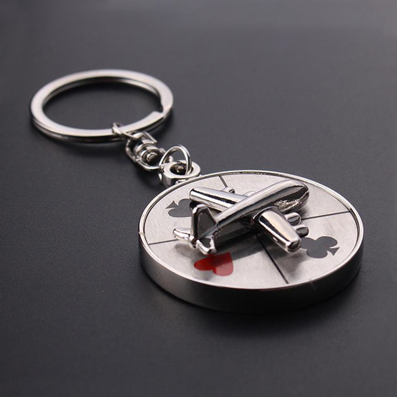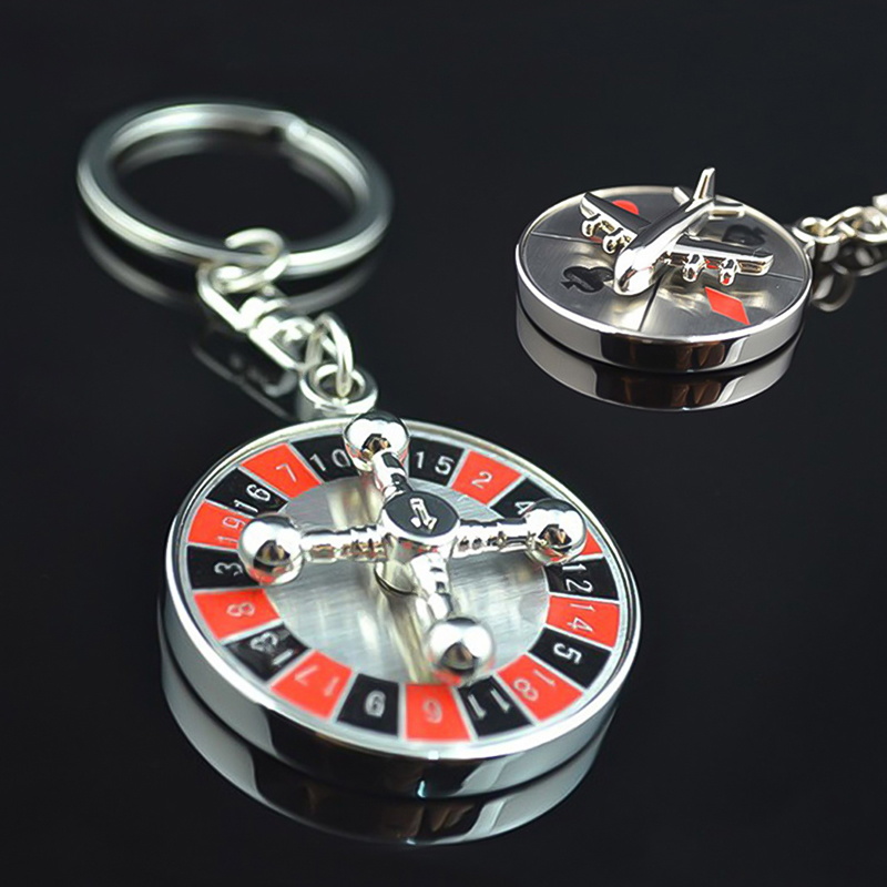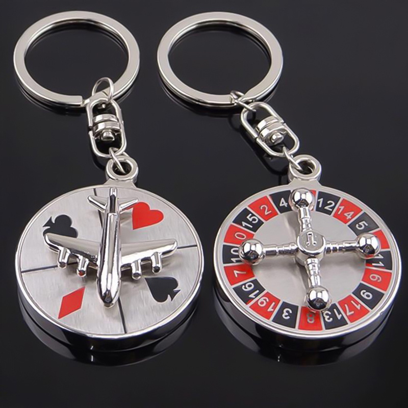 These rotatable metal keychains feature airplane and roulette designs, stylish, ideal for gaming lovers to organize keys or as unique, eye-catching accessories.