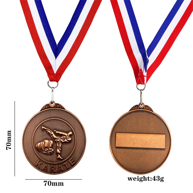 Crafted from antique gold/antique silver/antique bronze metal, this karate medal merges a weathered, retro texture with crisp embossed motifs: a dynamic kick stance, fist (iconic of the discipline), and bold "KARATE" lettering. It serves as a distinguished, nostalgia-tinged honor for acknowledging top skill and sportsmanship at karate tournaments and martial arts competitions.