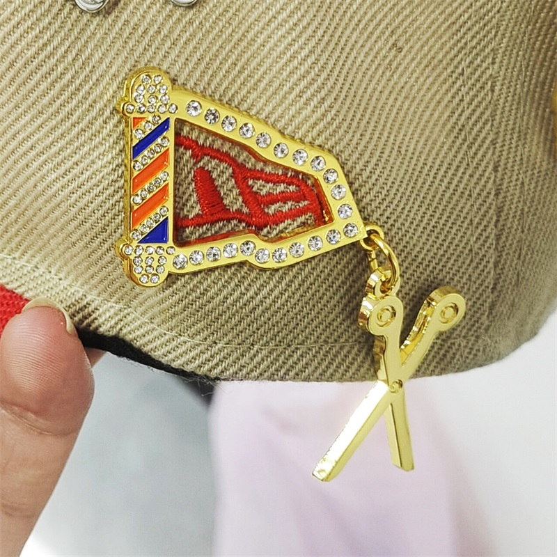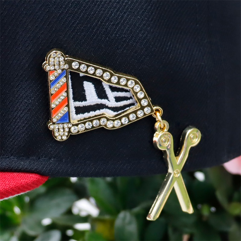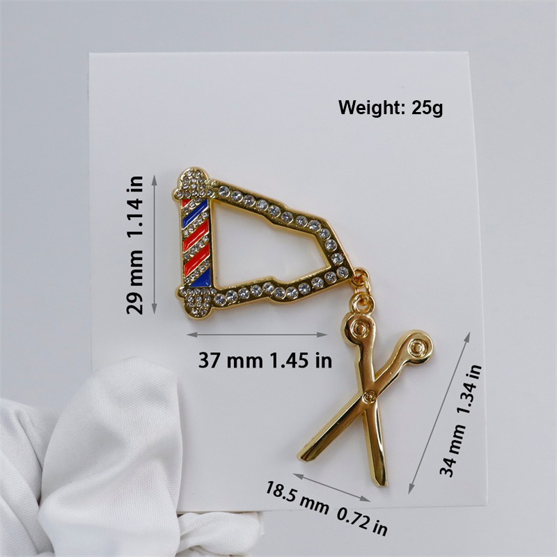 This pin features a diamond-trimmed barber flag shape (with iconic striped details) paired with a sleek gold scissors pendant, framed by fine metal. Designed to decorate caps or bags, it adds distinctive, shiny flair—ideal for barbers/barber culture fans to infuse personality into their accessories.
