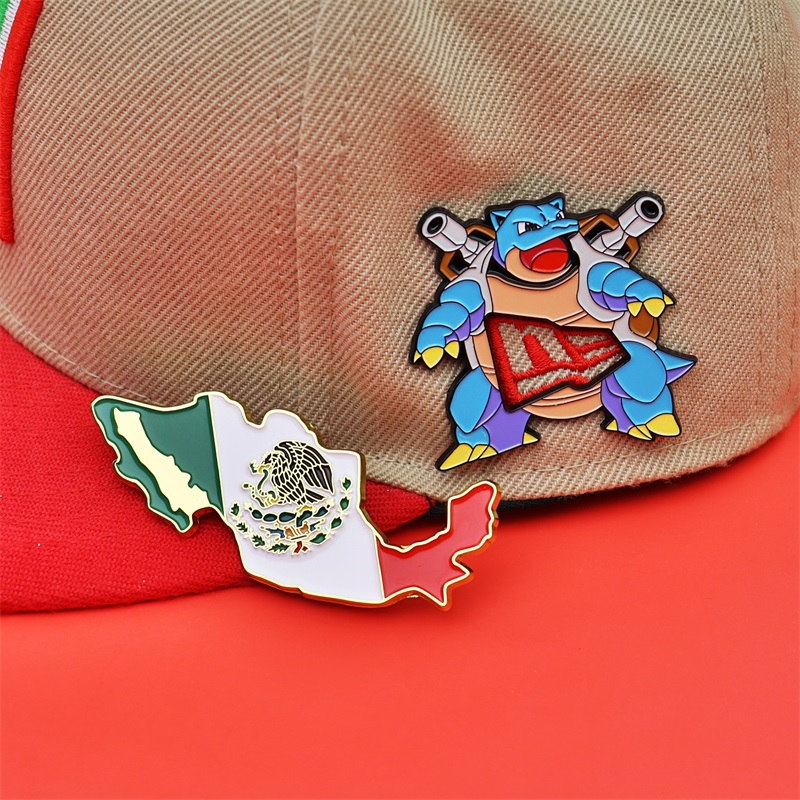 Featuring vibrant Pokémon Blastoise (with cannon details) & Mexico map (national emblem, gold trim), these pins decorate caps—ideal for Pokémon fans & Mexico culture lovers to add unique, themed flair.
