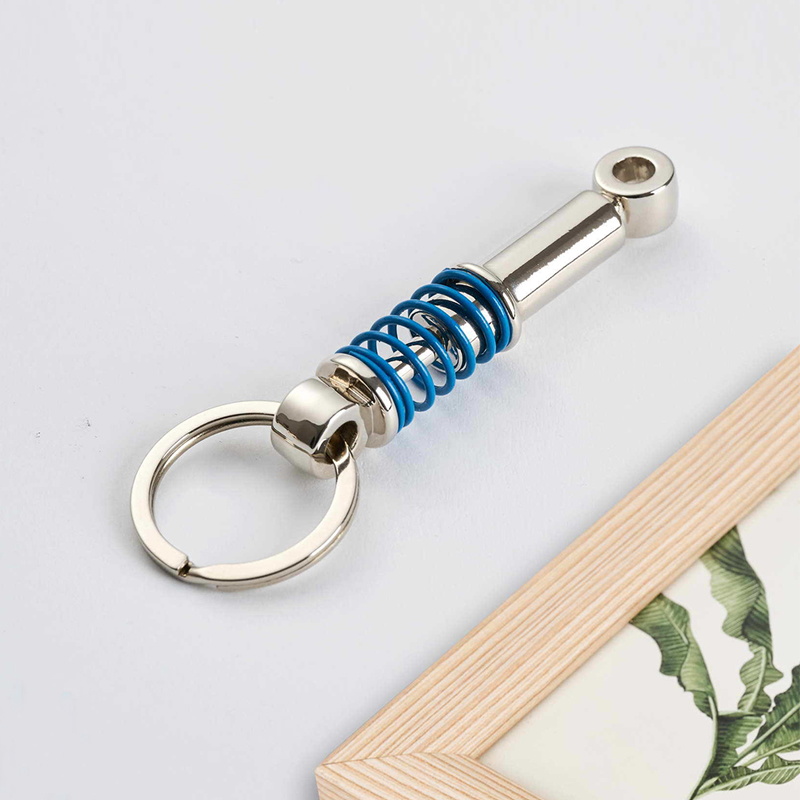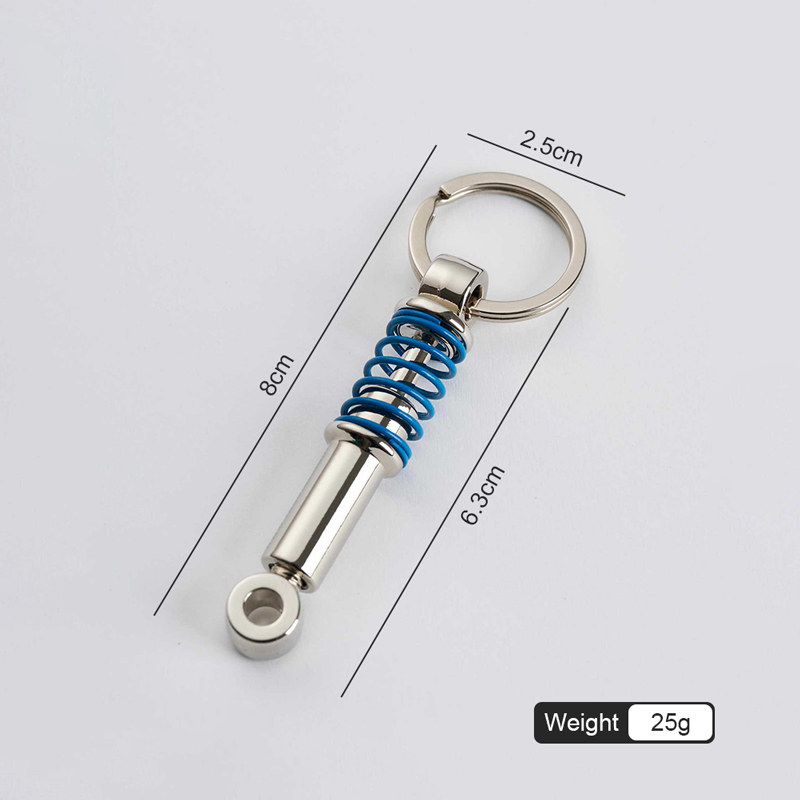 This keychain boasts a sleek metal shock absorber design, with a blue spring coiled around a silver cylindrical component, attached to a metal key ring. It embodies an industrial, automotive-inspired aesthetic, blending mechanical detailing and polished metal for a distinctive, gearhead-friendly look.