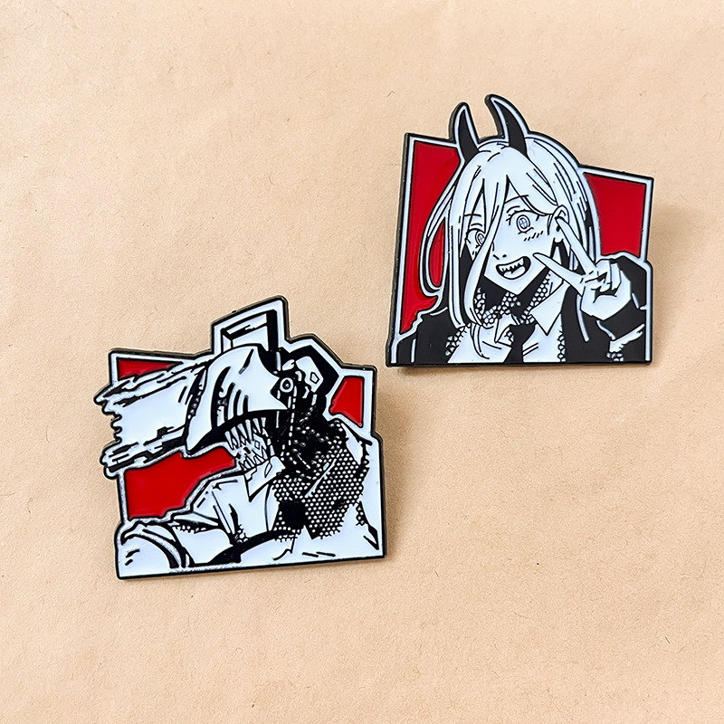 These 2 striking pins feature iconic Chainsaw Man characters (Power & Chainsaw Devil) with sharp black-white-red styling, capturing the series’ edgy vibe. Perfect for anime fans to adorn bags/jackets or display as bold fandom collectibles.