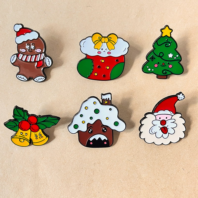 This Christmas pin set has 6 glossy enamel designs (gingerbread man, stocking, tree, bells, gingerbread house, Santa)—cozy, cheerful nods to holiday spirit. For festive fans, it adds warm flair to bags/jackets, ideal for holiday styling or seasonal, whimsical accessory decor.