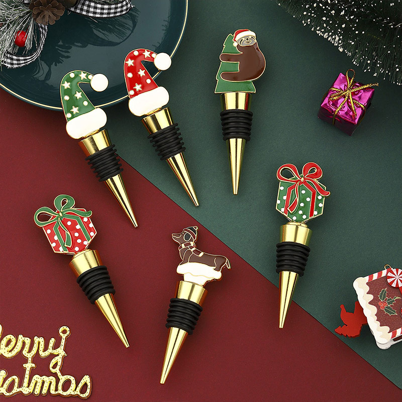 This set features festive shapes (Santa hat, gift box, sloth, dachshund) in classic red/green holiday hues, paired with gold bases. Each 34-38g stopper uses a silicone grip to seal wine tightly, doubling as Christmas decor—ideal for holiday parties, gifting, or adding seasonal cheer to wine collections.