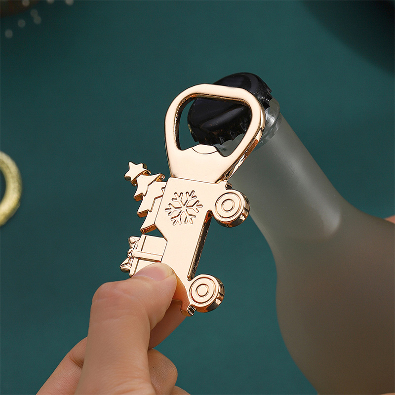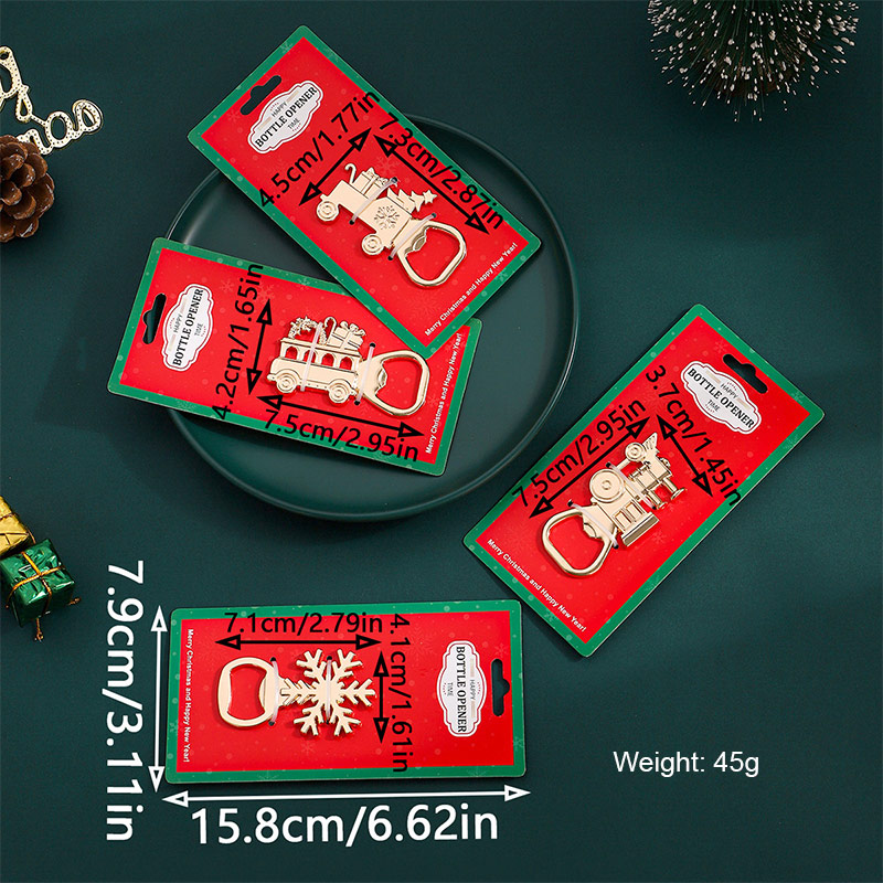 These 45g festive openers (gold/silver) feature Christmas motifs (snowflakes, trucks, trains). They easily open bottle caps, making them perfect holiday party favors, stocking stuffers, or decorative barware to add seasonal cheer to gatherings.