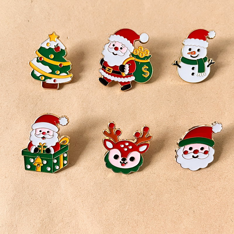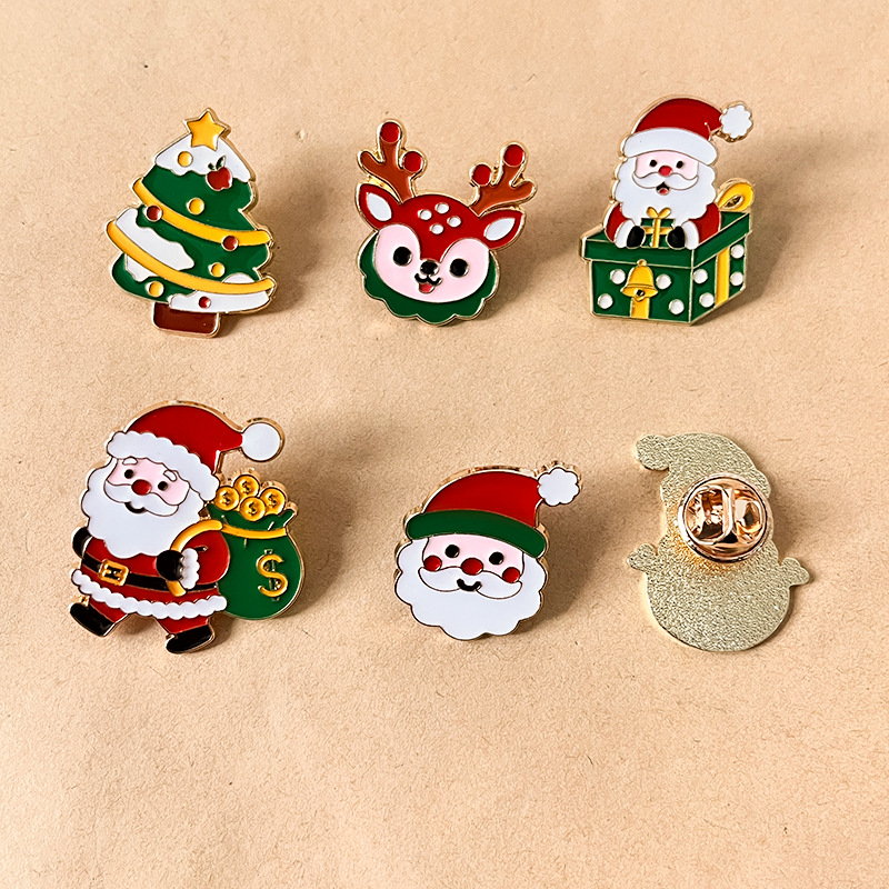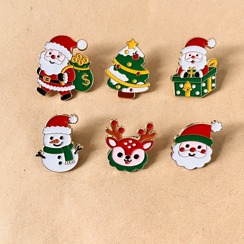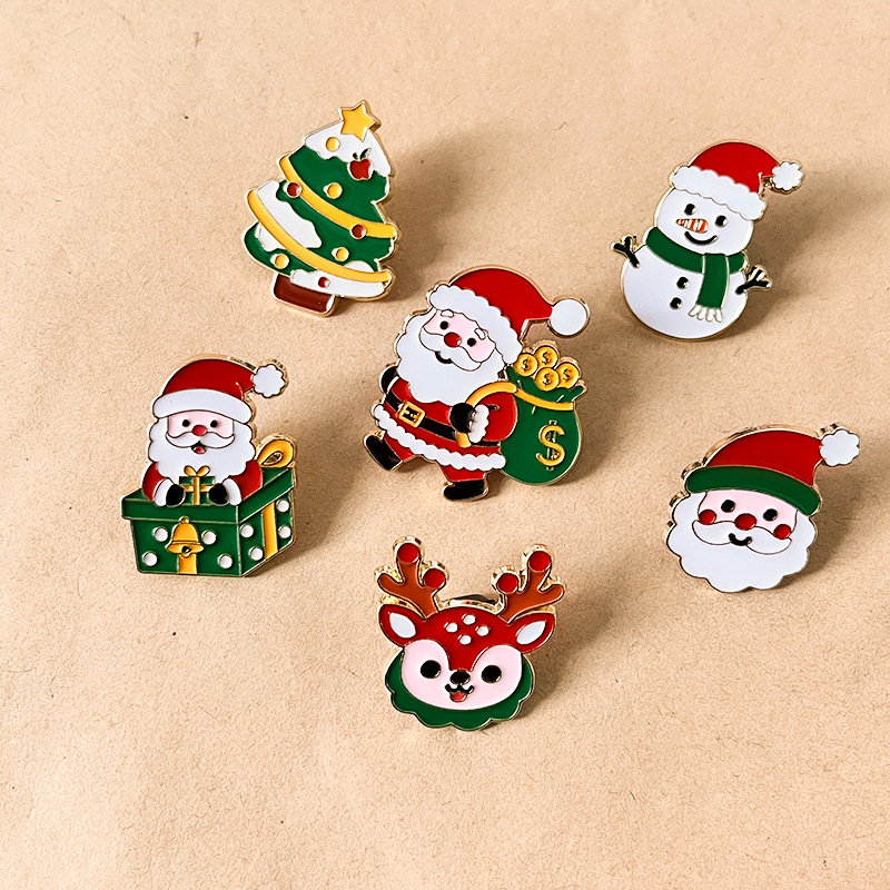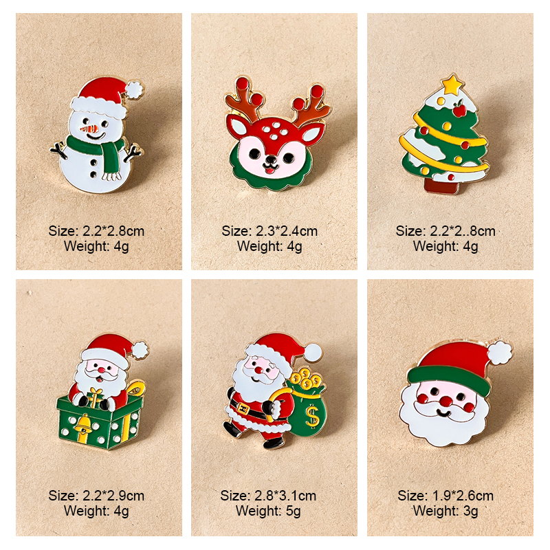 6 festive pins (Santa, tree, snowman, reindeer) — vibrant red/green enamel, cute holiday details. Perfect for adding Christmas cheer to bags/jackets; ideal for daily wear or holiday collectible decor.