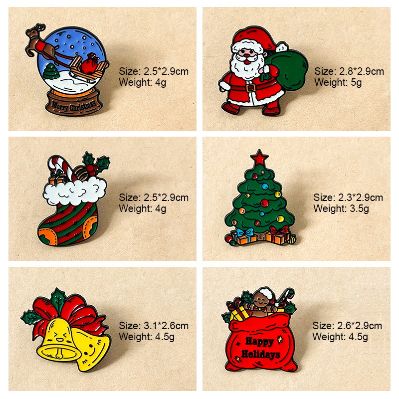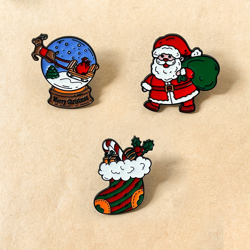 These Christmas pins feature varied festive shapes (sock, Santa, tree, bell, snow globe) with vivid colors and warm holiday details. They decorate caps or bags, adding cozy Christmas charm—perfect for holiday lovers to infuse accessories with festive joy.