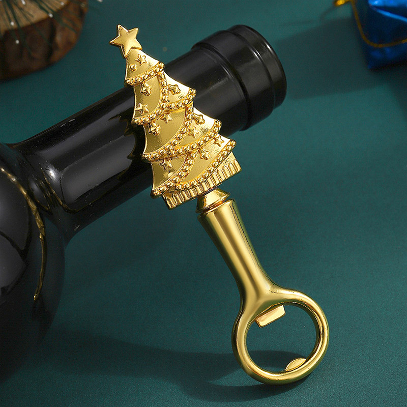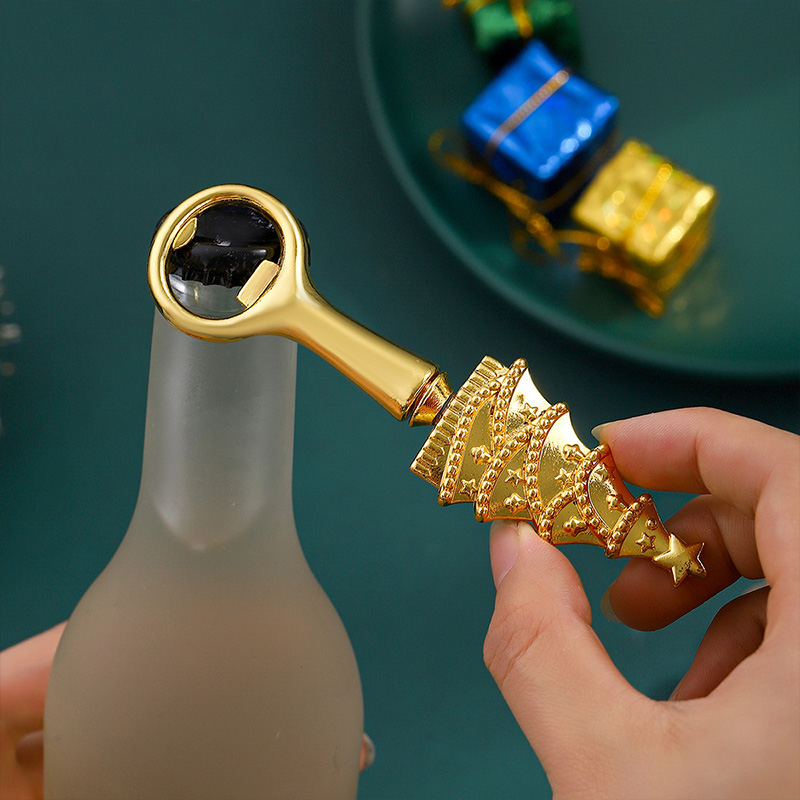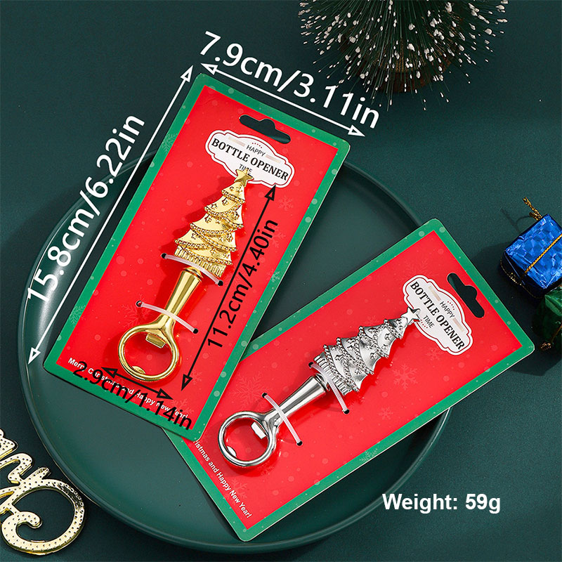 This 59g (15.8cm) gold/silver opener mimics a detailed Christmas tree design. It smoothly removes bottle caps, blending festive holiday charm with practicality—ideal for Christmas parties, gifting, or adding seasonal decor to barware.