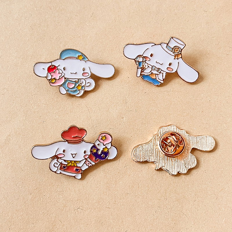 4 cute Cinnamoroll pins (with varied charming outfits) — whimsical, sweet flair. Perfect for Sanrio fans to add delicate style to bags/jackets; ideal for daily wear or cute character collectible decor.