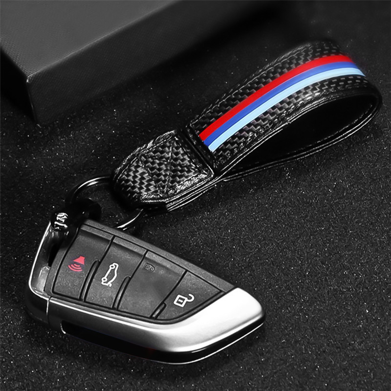 These carbon fiber keychains feature unique color stripes (red, blue-red-blue, red-yellow), offering car enthusiasts personalized, sporty accessories that stand out, perfect for showcasing automotive passion with distinctive design.