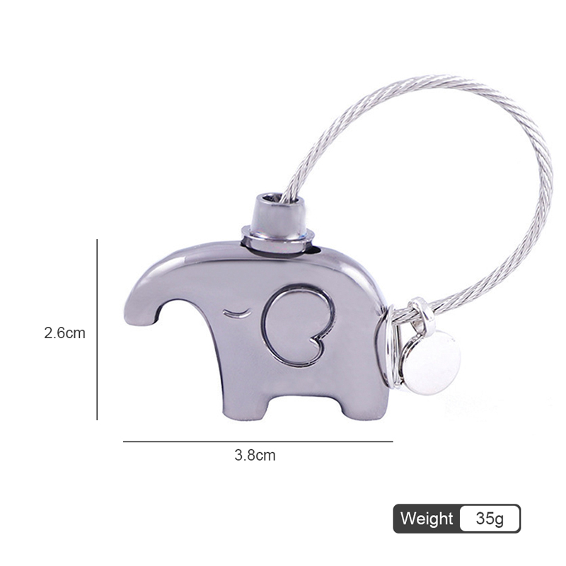This keychain set features two elephant charms—one gunmetal gray, one rose gold—made of polished metal, with silver cable loops. The metallic finish is sleek, and the contrasting colors make them a stylish, durable pair for couples.