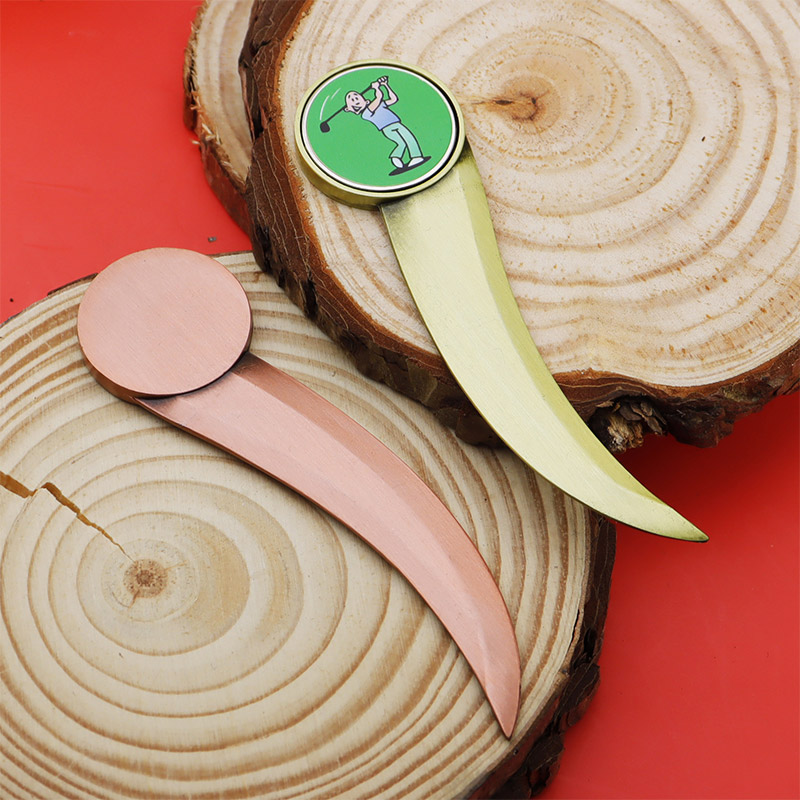 This 36g (10.2cm) curved blade-shaped tool (copper/gold) fixes green divots. It features a magnetic marker (with Masters/golfer designs) for convenience, blending sleek metallic style with on-course practicality—great for golf fans seeking functional, themed gear.