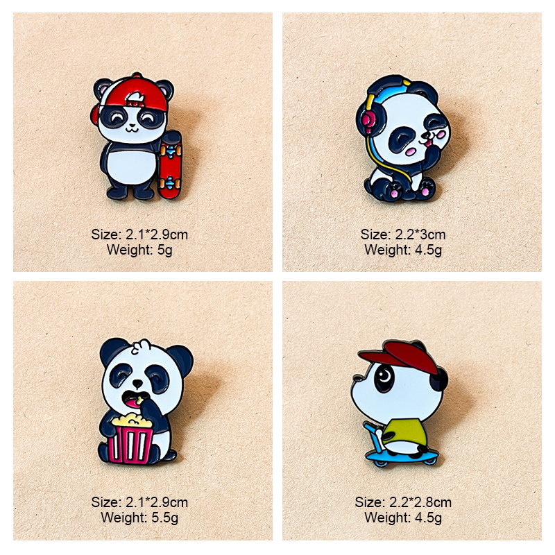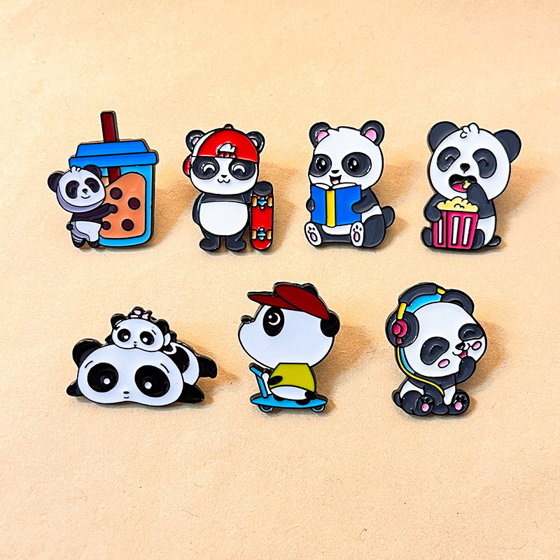 6 whimsical panda pins (with headphones, reading, napping, boba, scooter, popcorn, skateboard) — vivid enamel, lively expressions. Perfect for adding cute flair to bags/jackets; ideal for panda lovers’ playful collectibles.