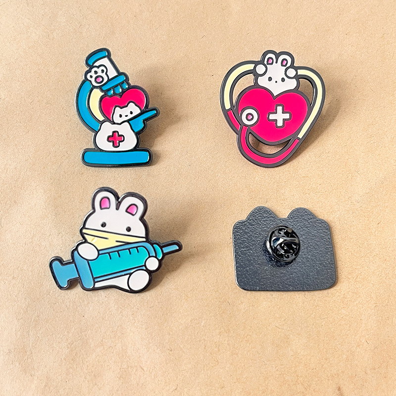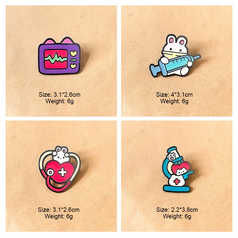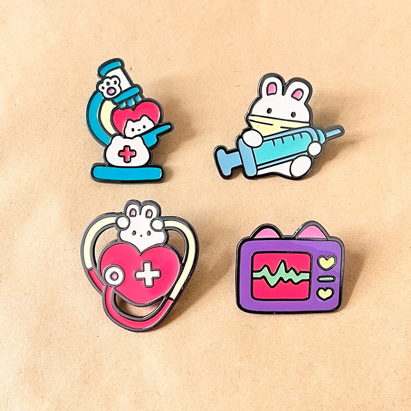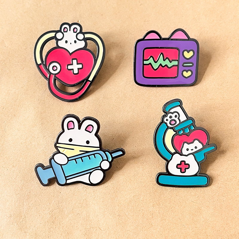 4 adorable medical pins (stethoscope rabbit, syringe bunny, etc.) — vibrant enamel, playful details. Perfect for healthcare workers/fans to add charming flair to bags/jackets; ideal for daily wear or medical collectible decor.
