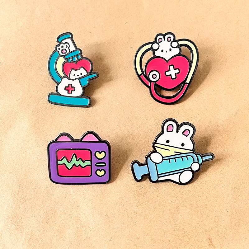 These 4 adorable medical-themed pins blend cute animals (bunnies, kitties) with healthcare elements (stethoscope, syringe, EKG monitor)—vibrant enamel brings their playful charm to life. Ideal for healthcare fans to add whimsical flair to bags/jackets; great for daily wear or showcasing your medical collectibles.