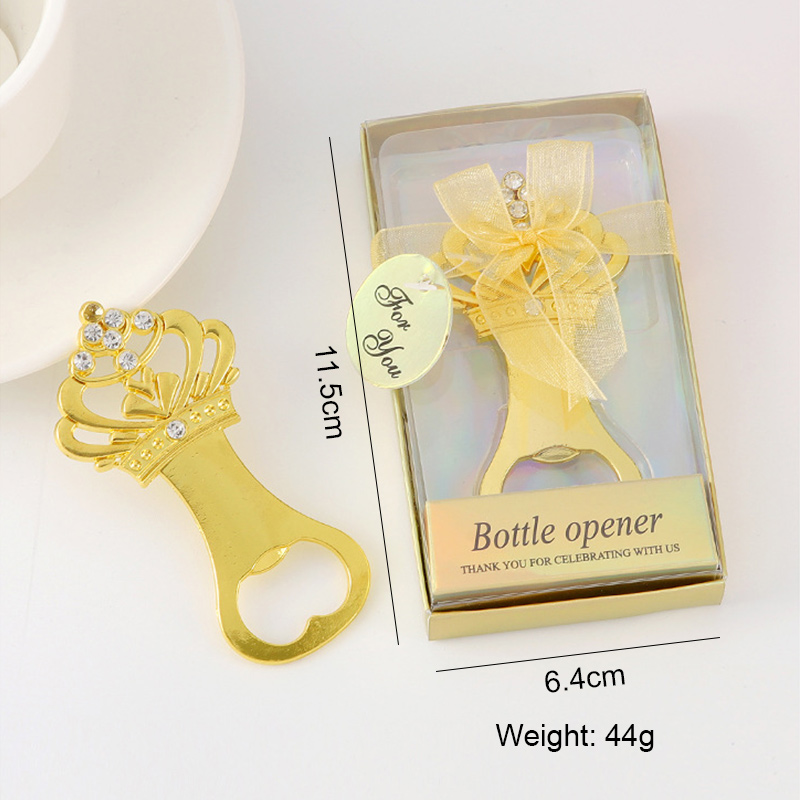 This 44g (11.5cm) gold opener features a sparkling crown design with embedded diamonds and a heart-shaped opening. It easily pops bottle caps, making it an elegant favor for weddings, birthdays, or royal-themed parties—packaged with a "For You" tag.
