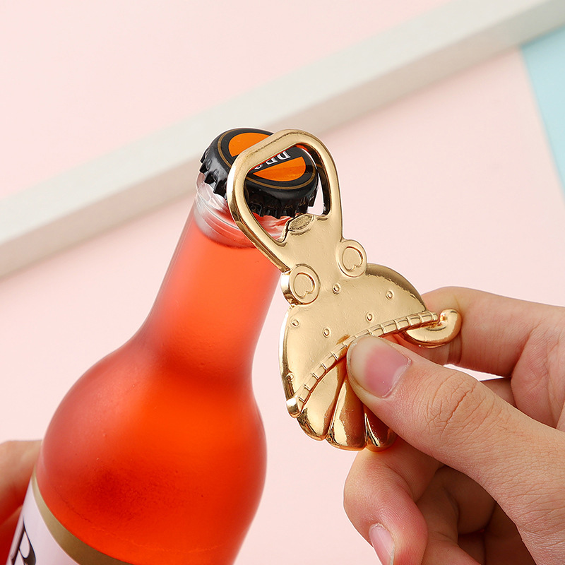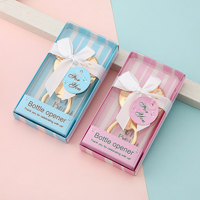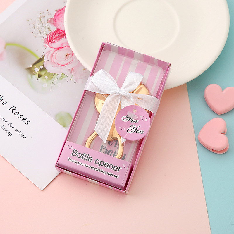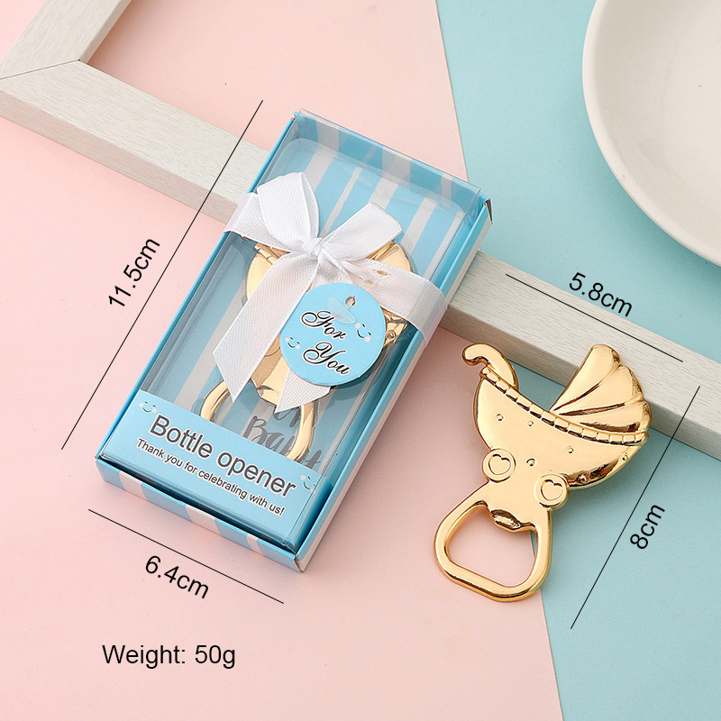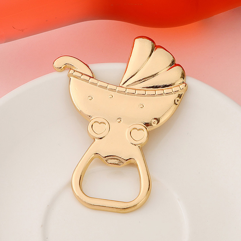 This 50g (8cm) opener is shaped like a glossy gold baby carriage (with heart details). It pops caps smoothly, blending cute baby-shower charm with elegant decor style—ideal for gender reveals, baby celebrations, or a sweet gift for new parents.