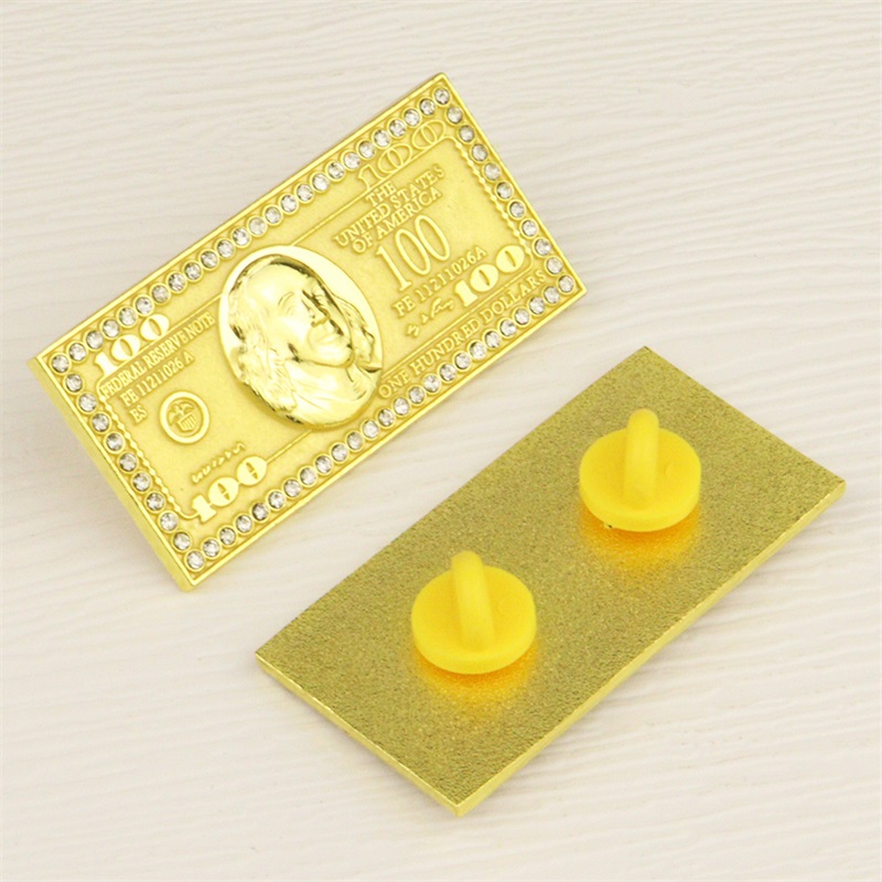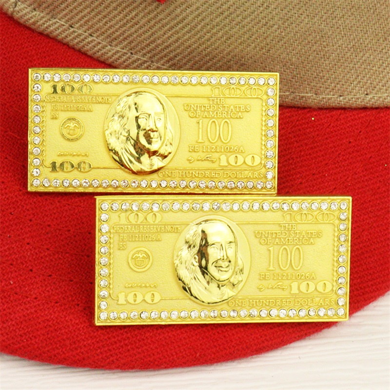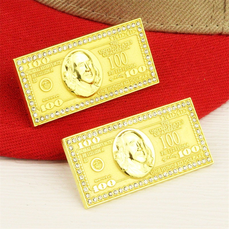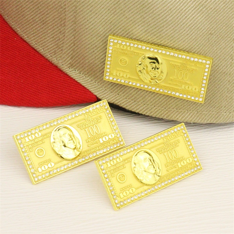 Lifelike $100 bill shape, glossy gold-plated texture, sparkling rhinestones trim. Ideal for dressing up clothes/hats—trendy, eye-catching, a unique decorative accessory.