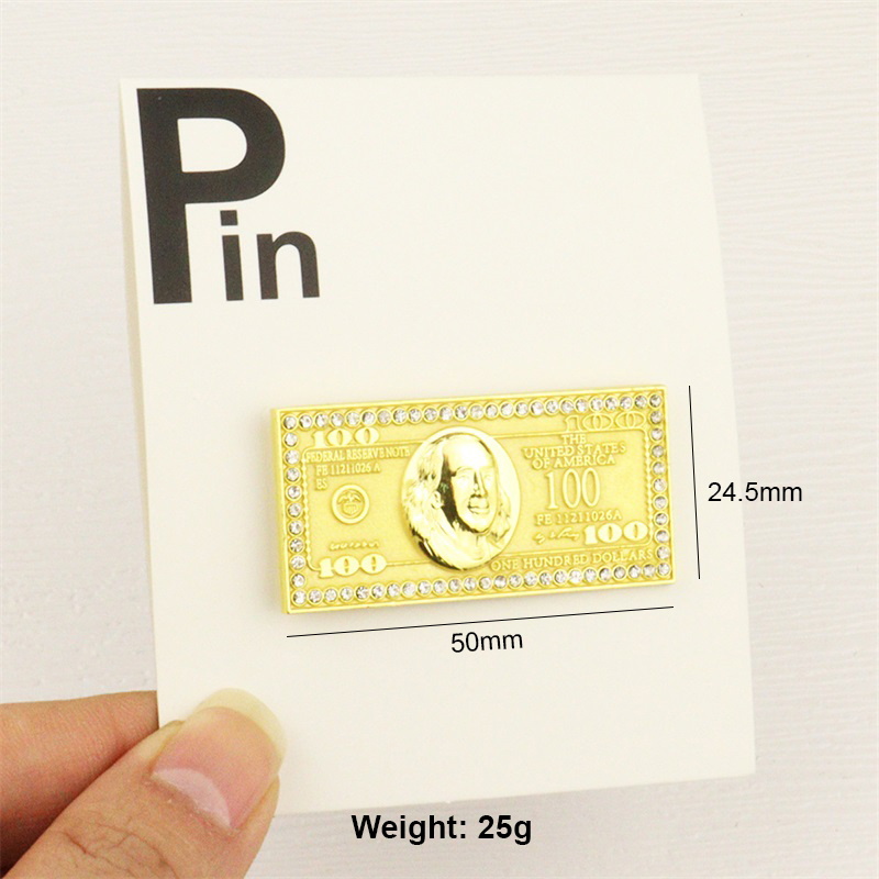 This pin features a lifelike 100USD bill shape, finished with glossy gold plating and framed by sparkling rhinestones. It decorates clothes, caps or bags, adding trendy, eye-catching details—ideal for style lovers to craft unique, standout looks with this shiny accessory.