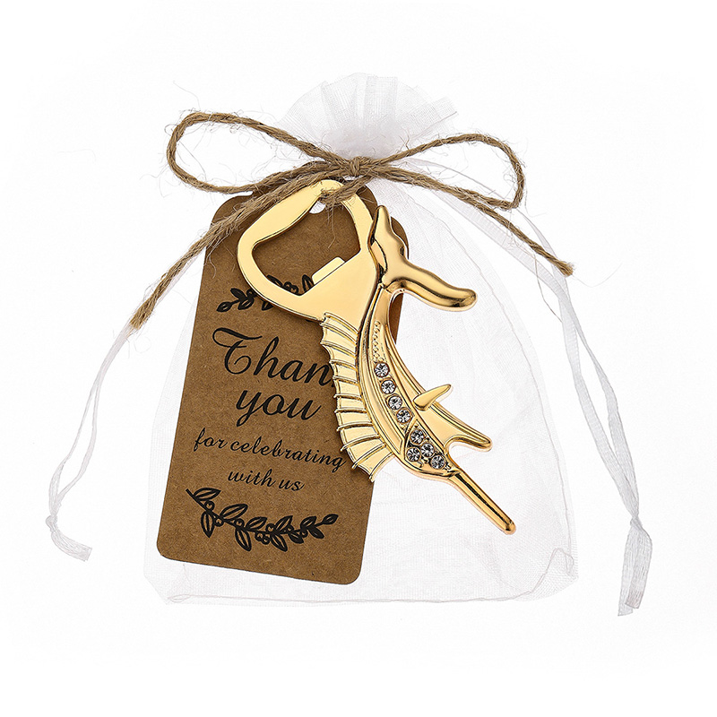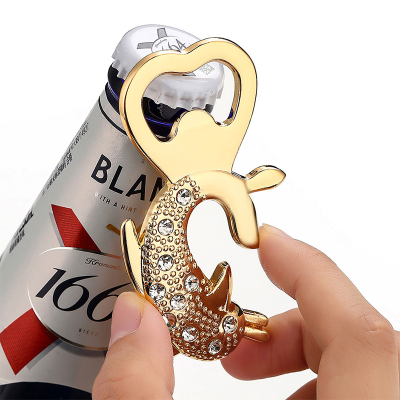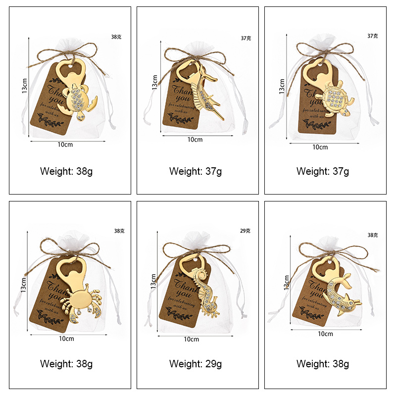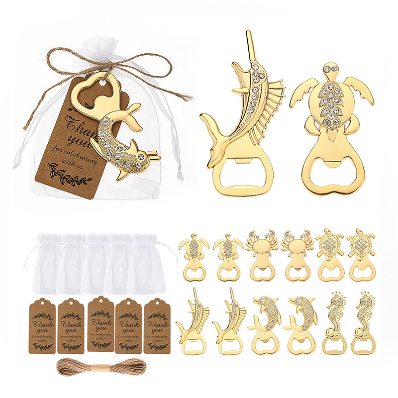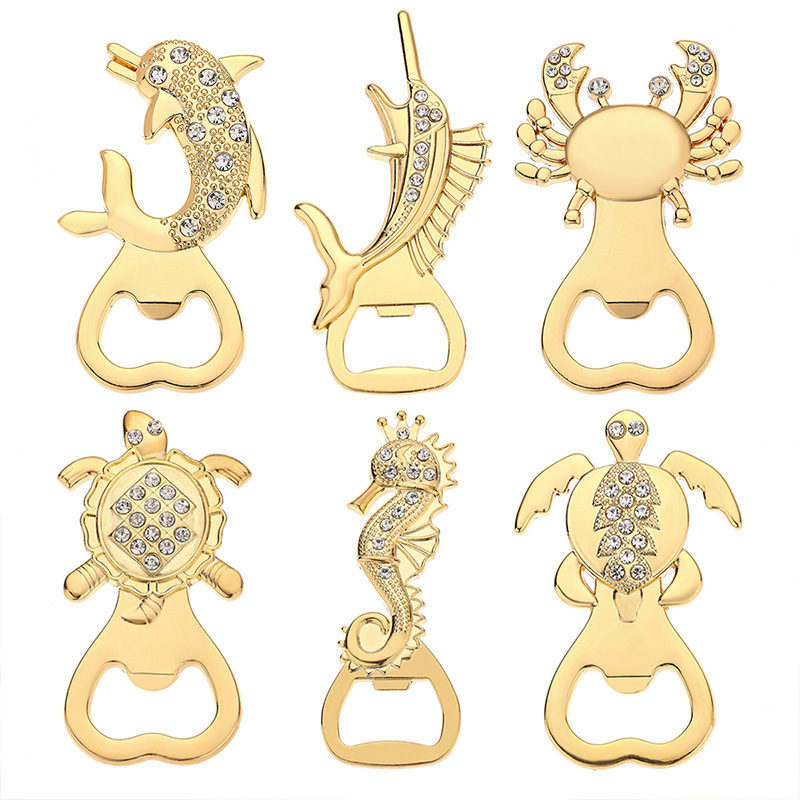 These 29–38g gold openers mimic dolphins, seahorses, or turtles (adorned with sparkles). They pop caps easily, making them glamorous favors for beach weddings, nautical events, or a shiny gift for ocean-life enthusiasts.