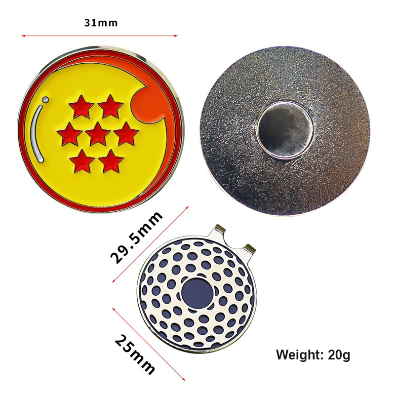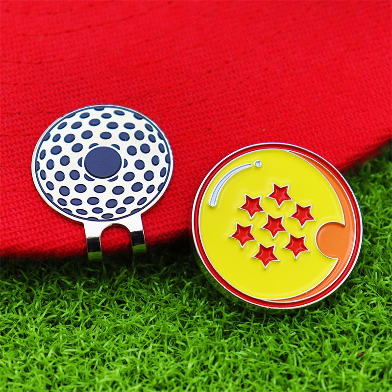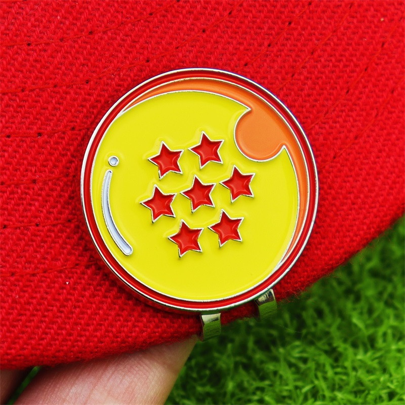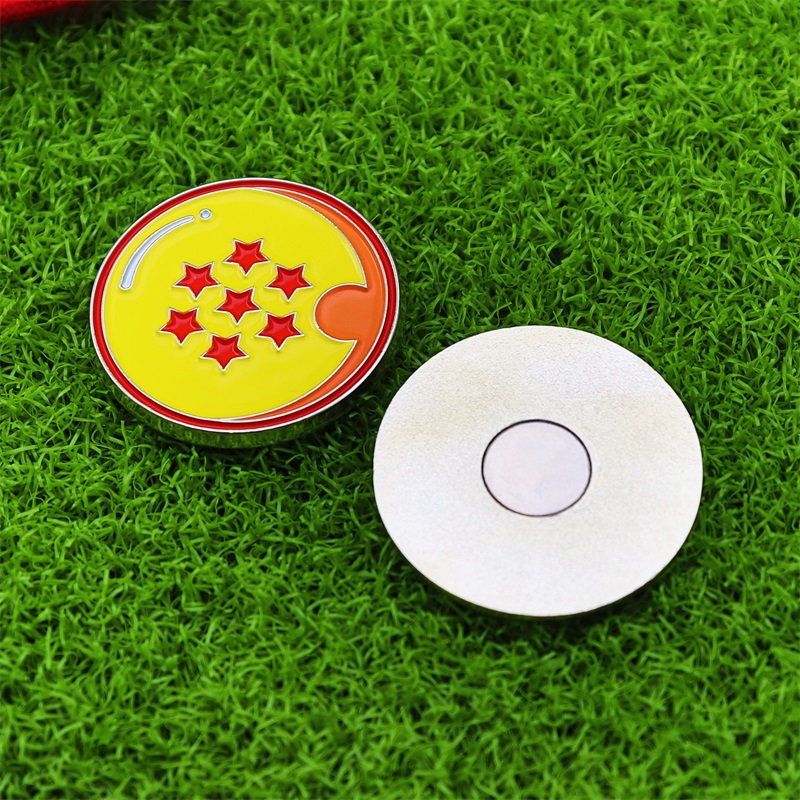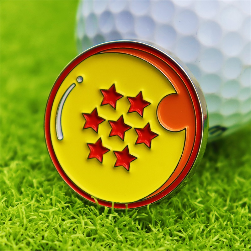 Fun Golf AccessoriesFeaturing polka-dot golf ball & Dragon Ball-style (yellow base, red stars) shapes with shiny metal borders, these act as markers + cap/bag decor—perfect for golf/Dragon Ball fans to add fun, functional flair.