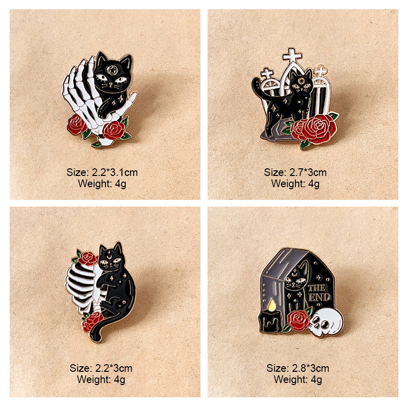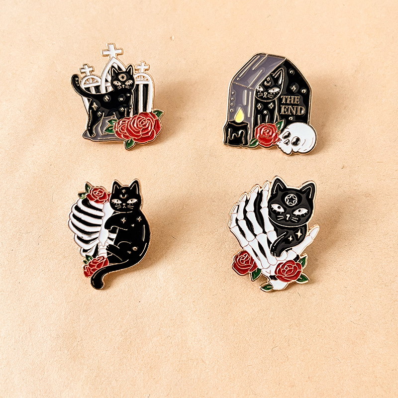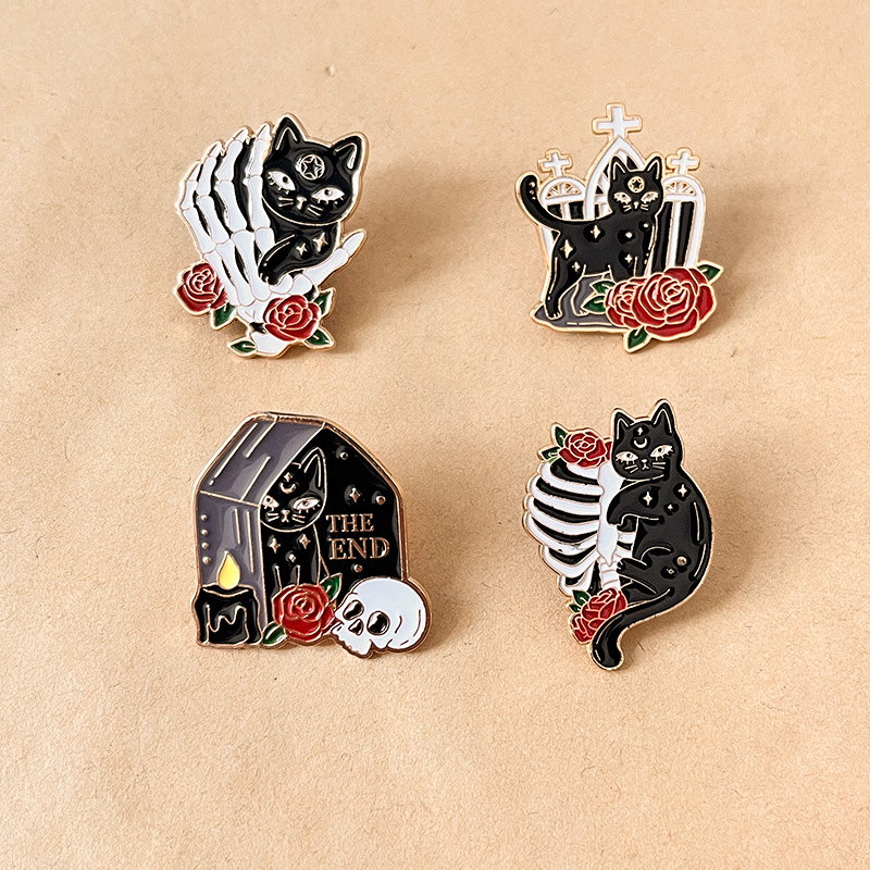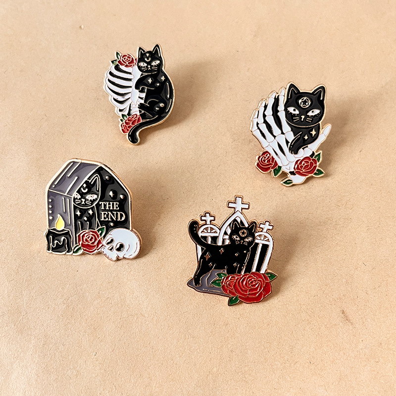 This gothic black cat pin set has 4 dark-chic designs (cat + cemetery/coffin/skeleton) paired with red roses—moody, occult charm. For goth lovers, it adds edgy flair to bags/jackets, ideal for alternative styling or infusing outfits with spooky, stylish dark personality.
