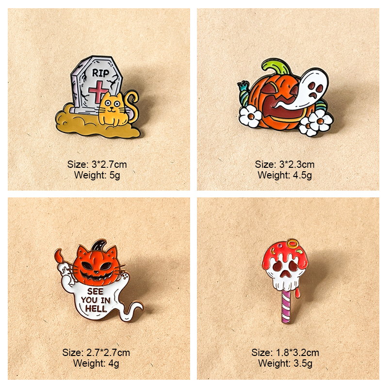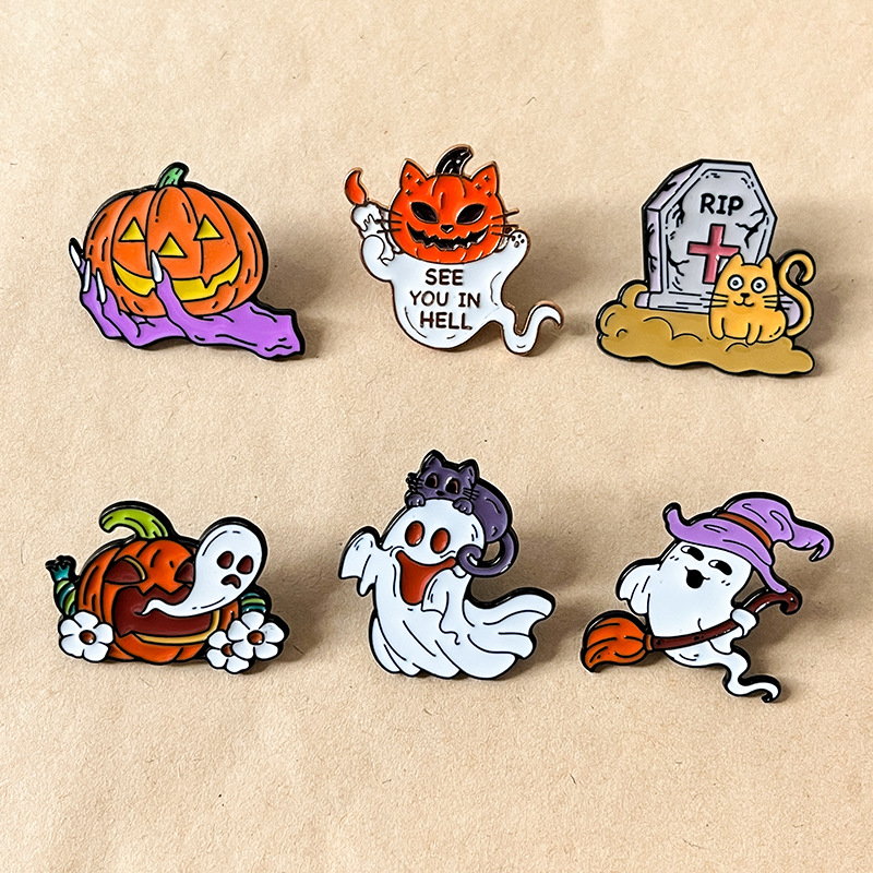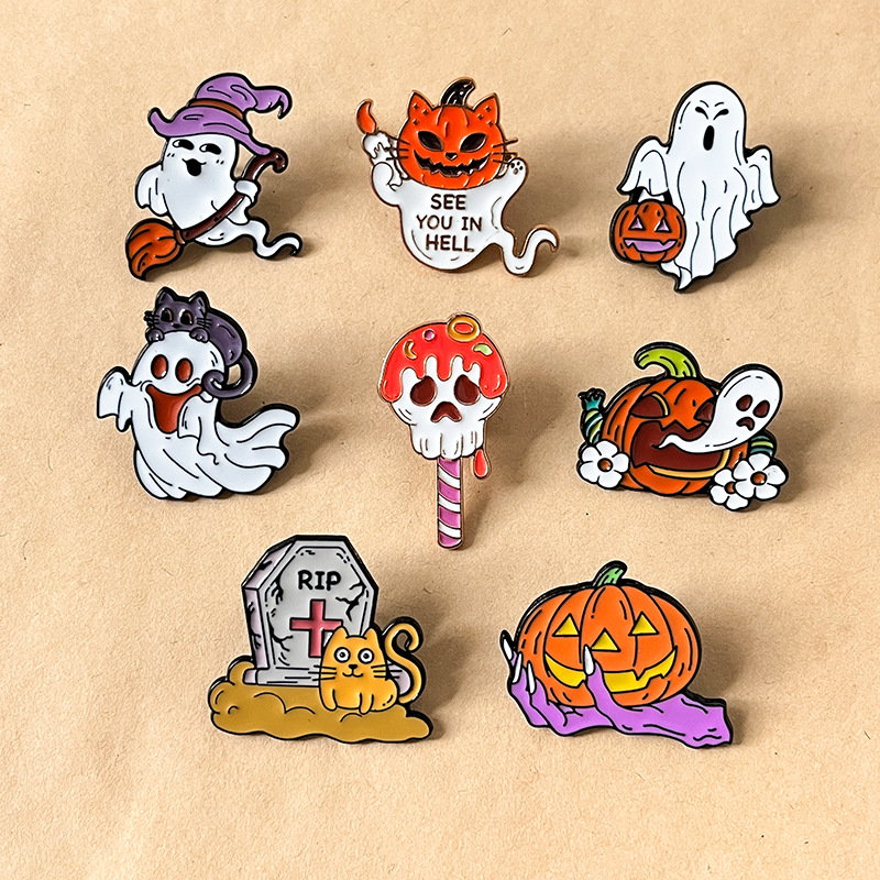 These Halloween enamel pins feature varied spooky-cute shapes (ghosts, pumpkins, tombstones) with quirky, playful designs. They decorate caps and bags, ideal for Halloween fans to infuse festive, whimsical-spooky charm into their accessories.