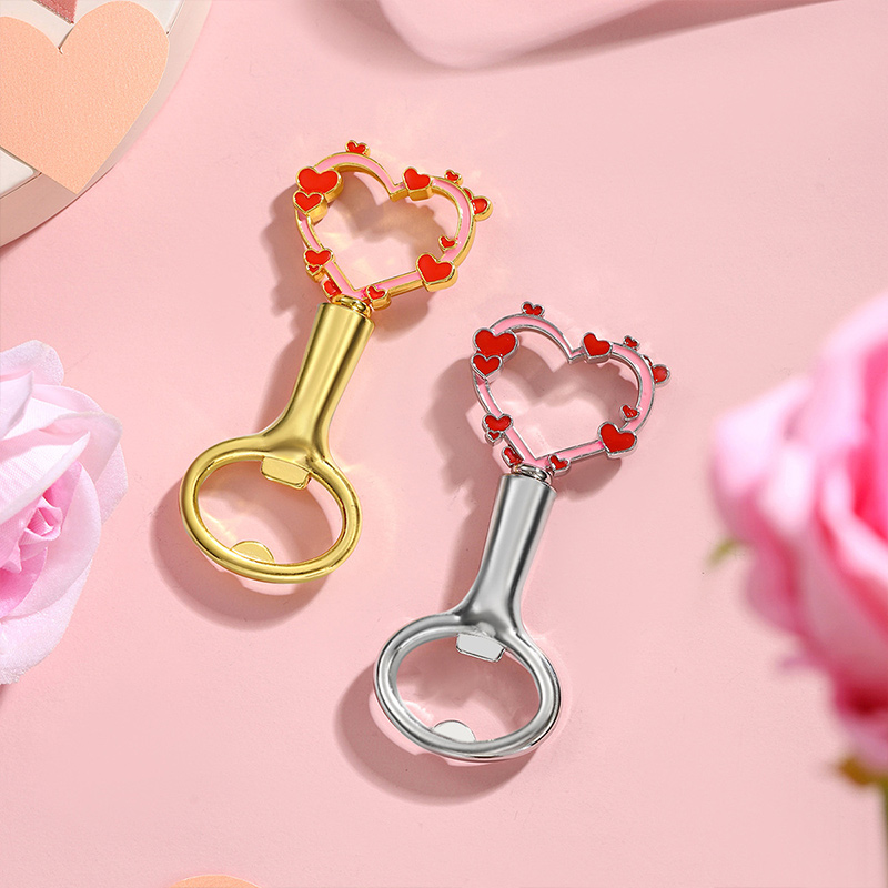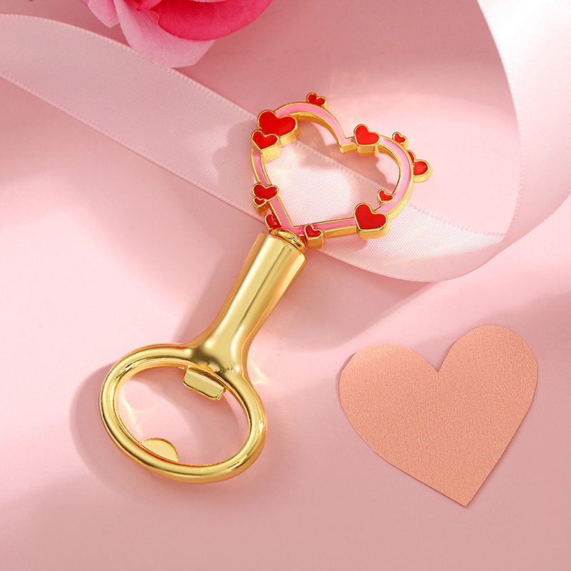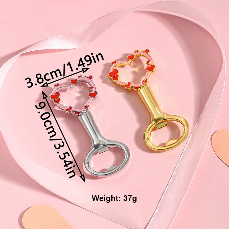 This 37g (9cm) opener features a large heart frame dotted with tiny red hearts, in glossy gold/silver. It pops caps easily, radiating romantic charm—ideal for engagement parties, anniversary events, or a sweet gift for heart-themed gathering lovers.