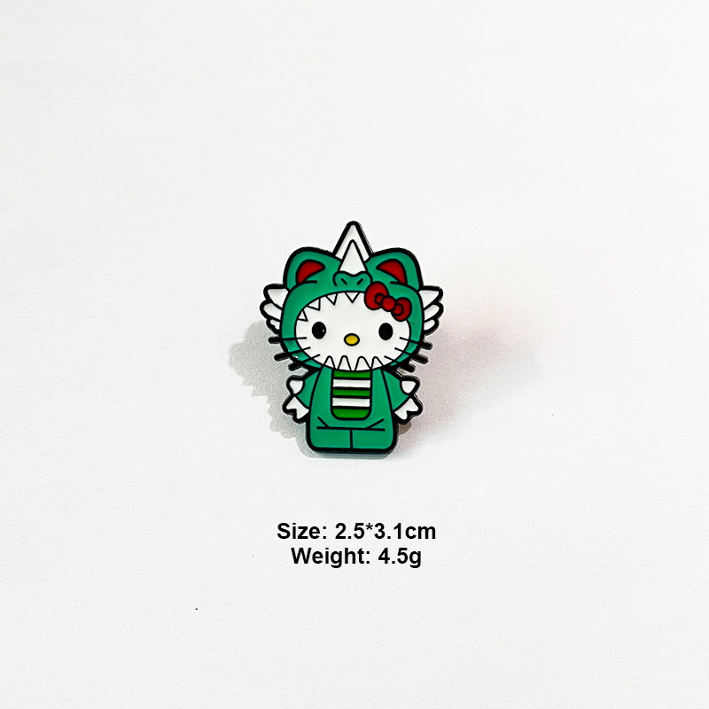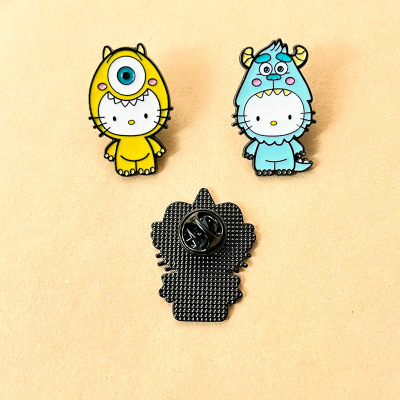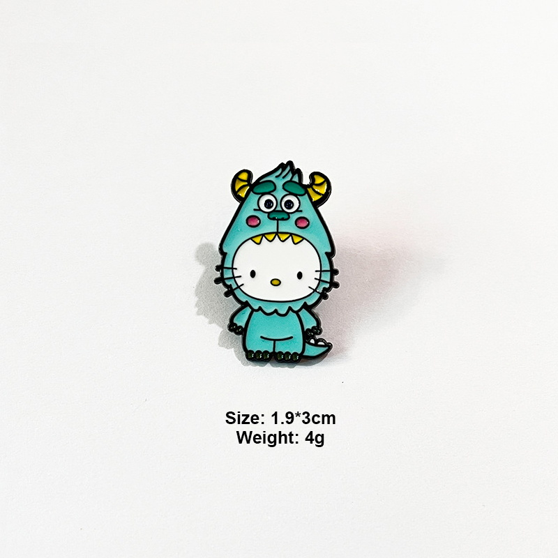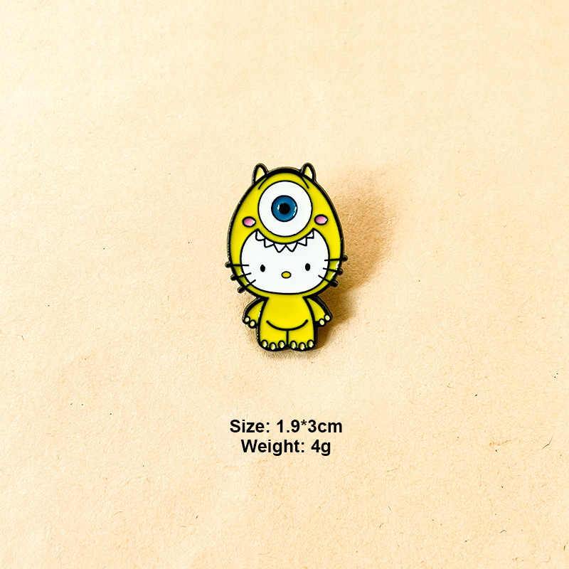 3 quirky pins (Hello Kitty as one-eye monster, dragon, blue beast) — vivid enamel, cute-creature fusion. Perfect for adding whimsical flair to bags/jackets; ideal for Sanrio/monster fans’ crossover collectibles.