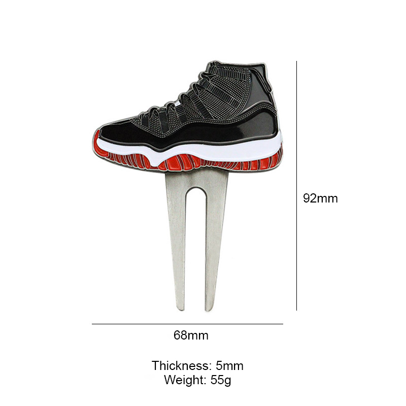 This 55g (92mm) high-top sneaker-shaped tool (black/white/red) fixes green divots with its 5mm durable build. Its detailed iconic shoe design blends streetwear flair with on-course functionality—perfect for golfers craving style and utility.