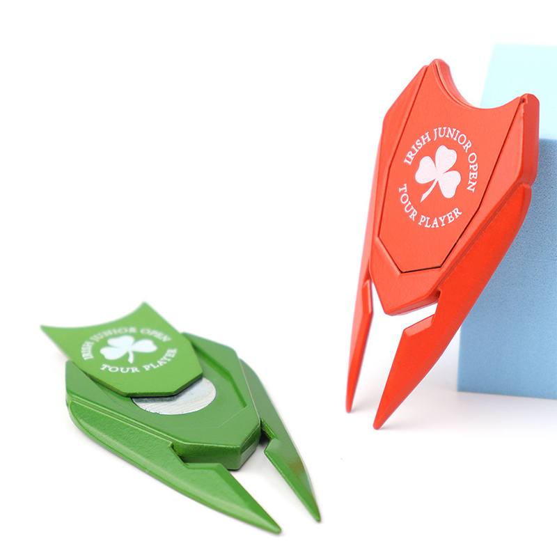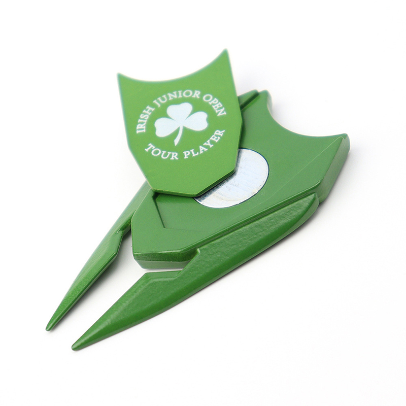 This 31g (64mm) tool features "Irish Junior Open Tour Player" branding + 4-leaf clover, in 5 hues (orange/white/green/yellow/red). At 5.7mm thick, it’s lightweight, durable for green repairs, and perfect for commemorating the event or adding themed flair to rounds.