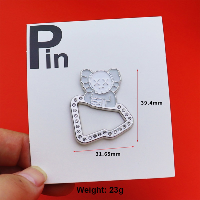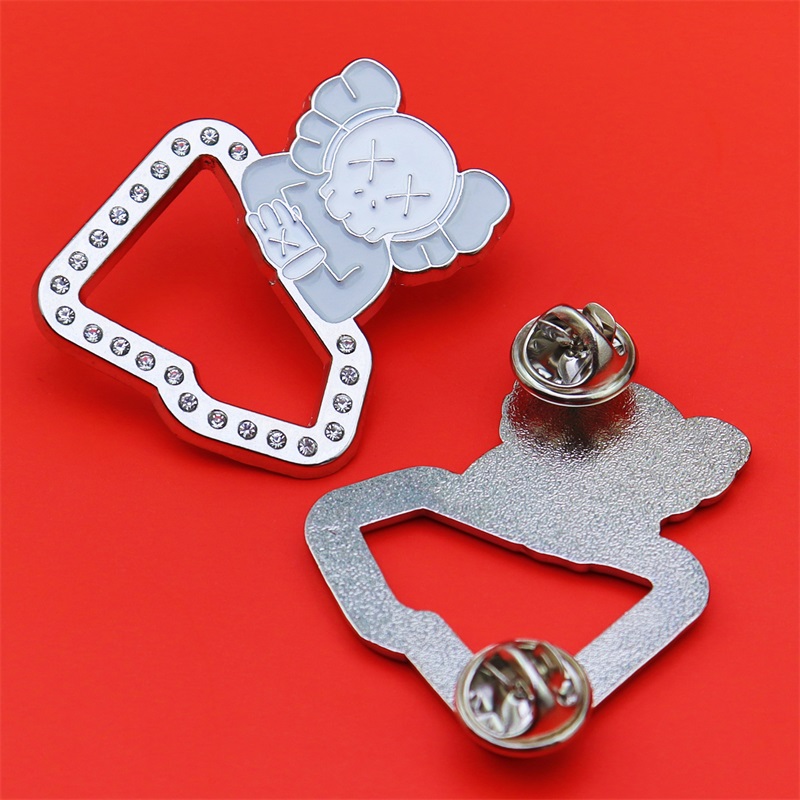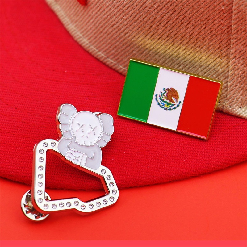 This set features a geometric, crystal-lined frame (angular, open shape) for the Kaws character (rounded, iconic "XX" silhouette) and a sharp rectangular Mexico flag pin. Designs mix sleek metallic accents, sparkling crystals, and bold national colors—modern, eye-catching, and full of stylized charm.