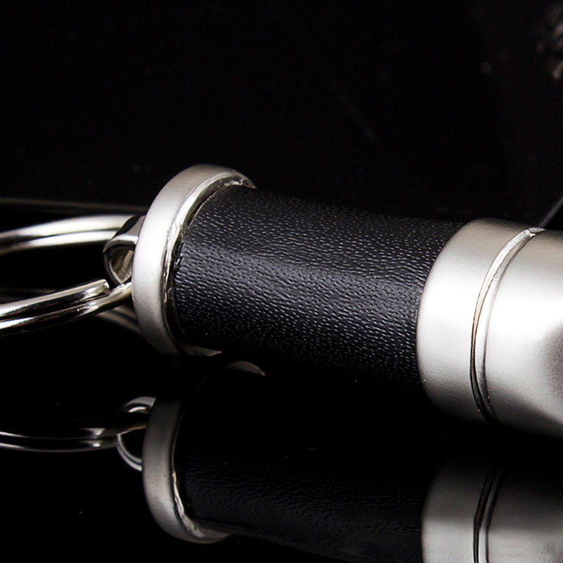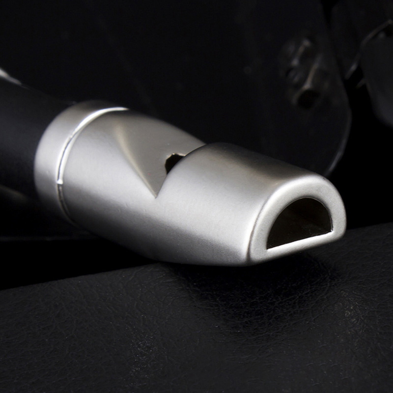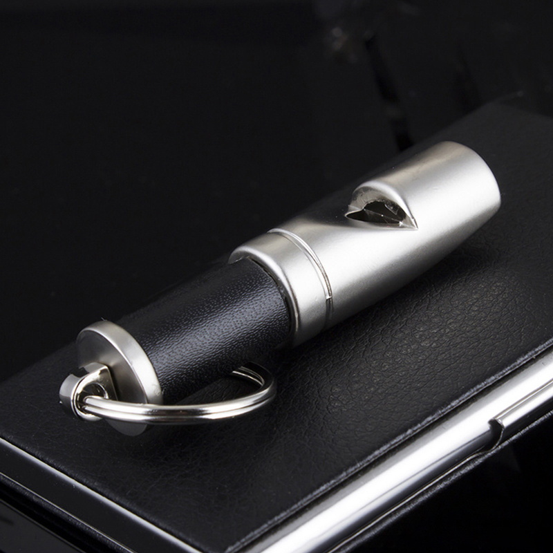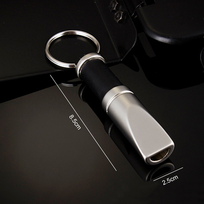 This whistle keychain has a polished metal body with a black leather grip, attached to a silver key ring. It’s stylish, durable, and ideal for outdoor safety, combining texture and functionality in a refined design.