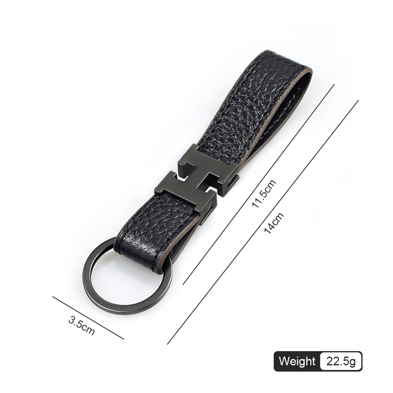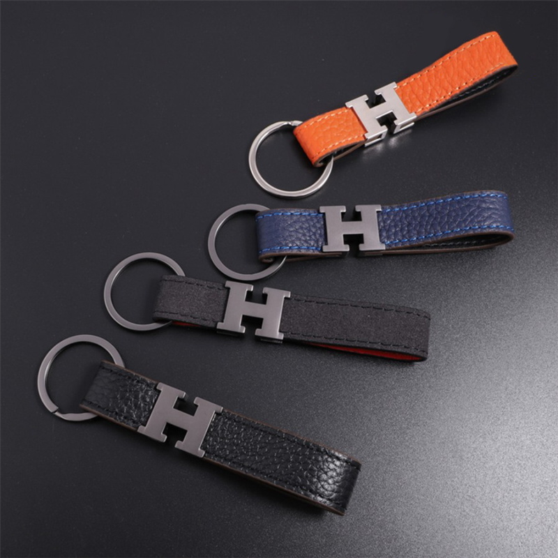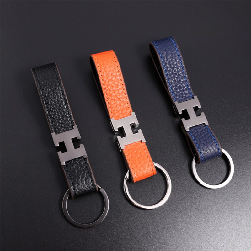 This keychain boasts sophisticated leather straps and polished metallic H-buckles in vibrant orange, deep blue, and sleek black. With a luxurious, minimalist design, it’s an ideal chic accessory for car keys, perfect for daily use or gifting to those who crave refined, stylish practicality.