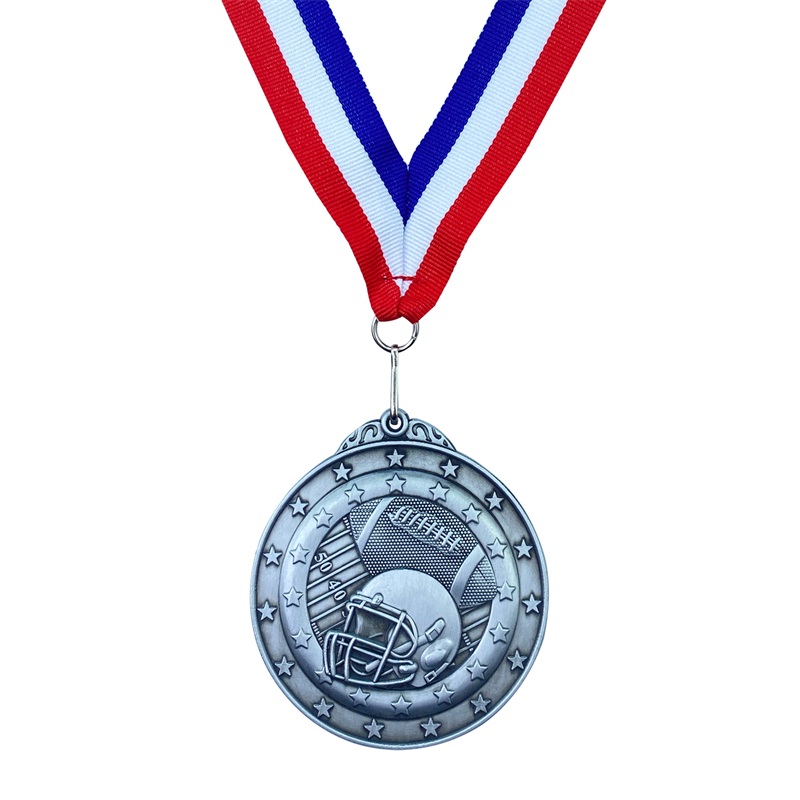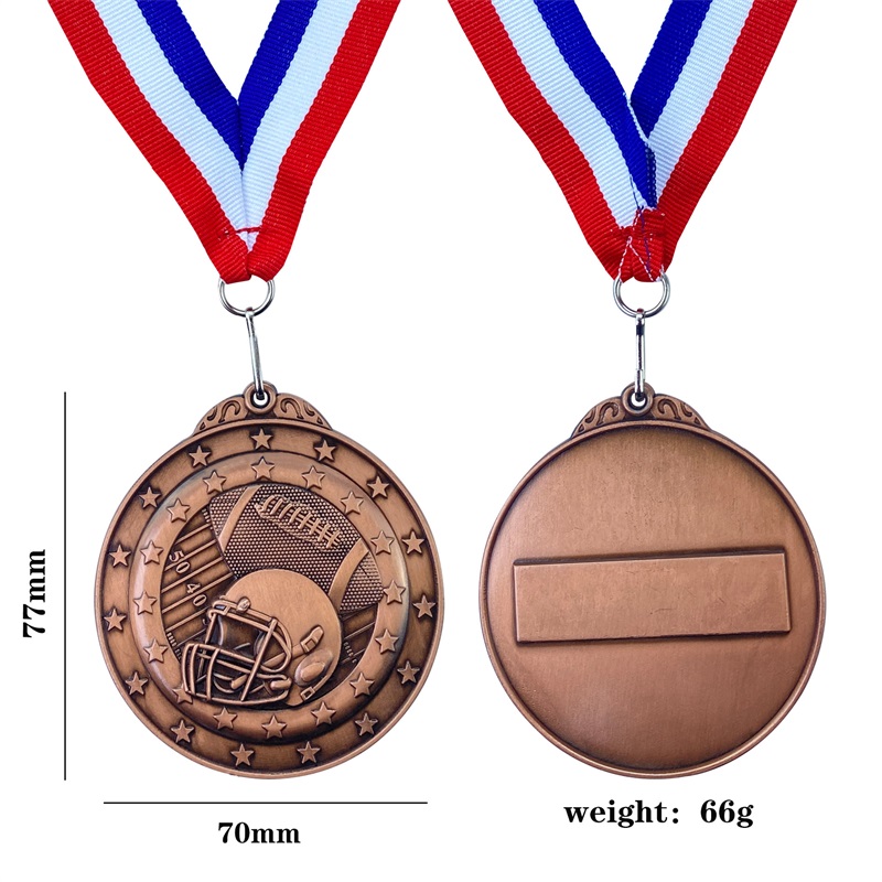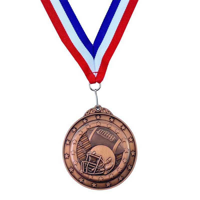 Adorned with a bold star border and vivid football motifs (helmet, playfield), this antique gold/silver/red copper medal suits youth flag football finals, high school playoff MVPs, or pee-wee league sportsmanship awards. Its rugged metal build pairs sport-specific flair with timeless design for meaningful on-field recognition.