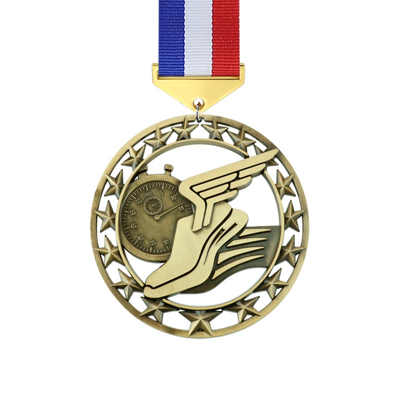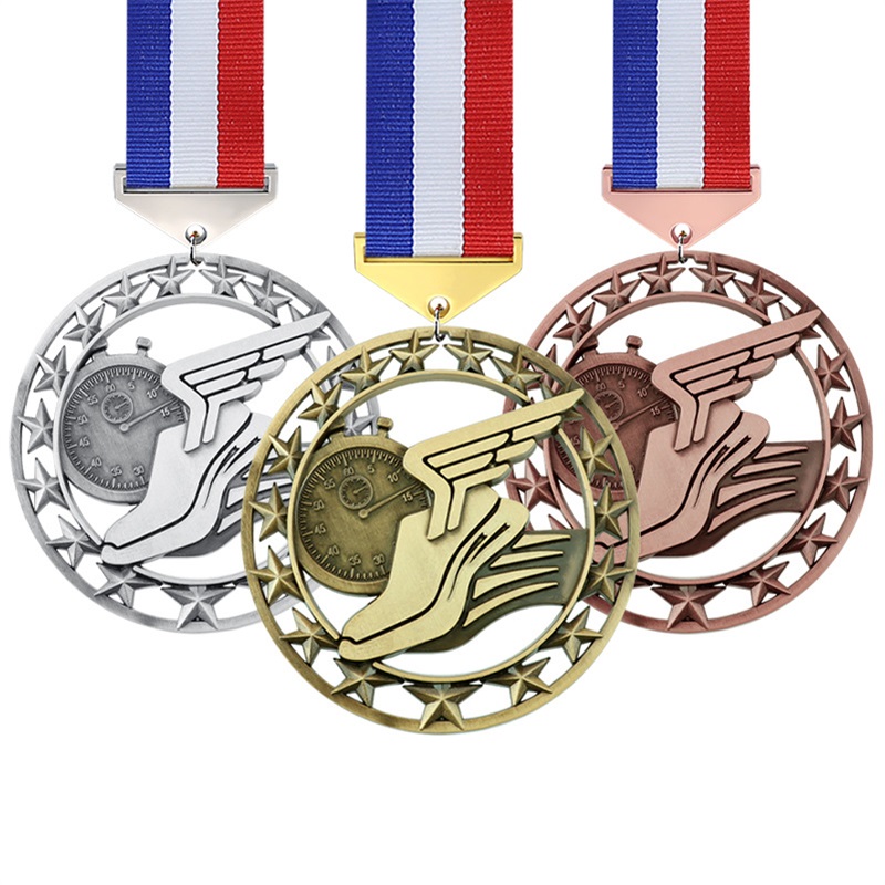 This track & field medal (gold/silver/copper metal) features dynamic motifs: a winged running shoe and stopwatch, framed by stars. Crafted for running races, its sleek cut-out design blends athletic energy with durable build—ideal for honoring speed and race achievements.