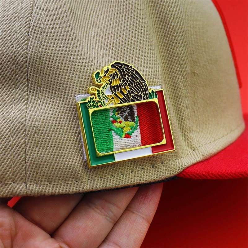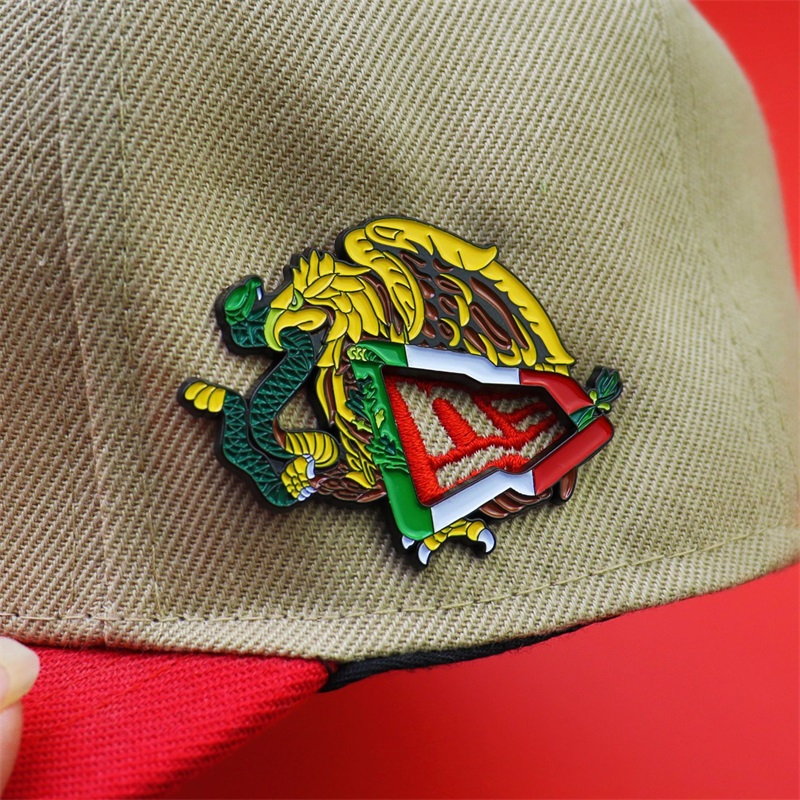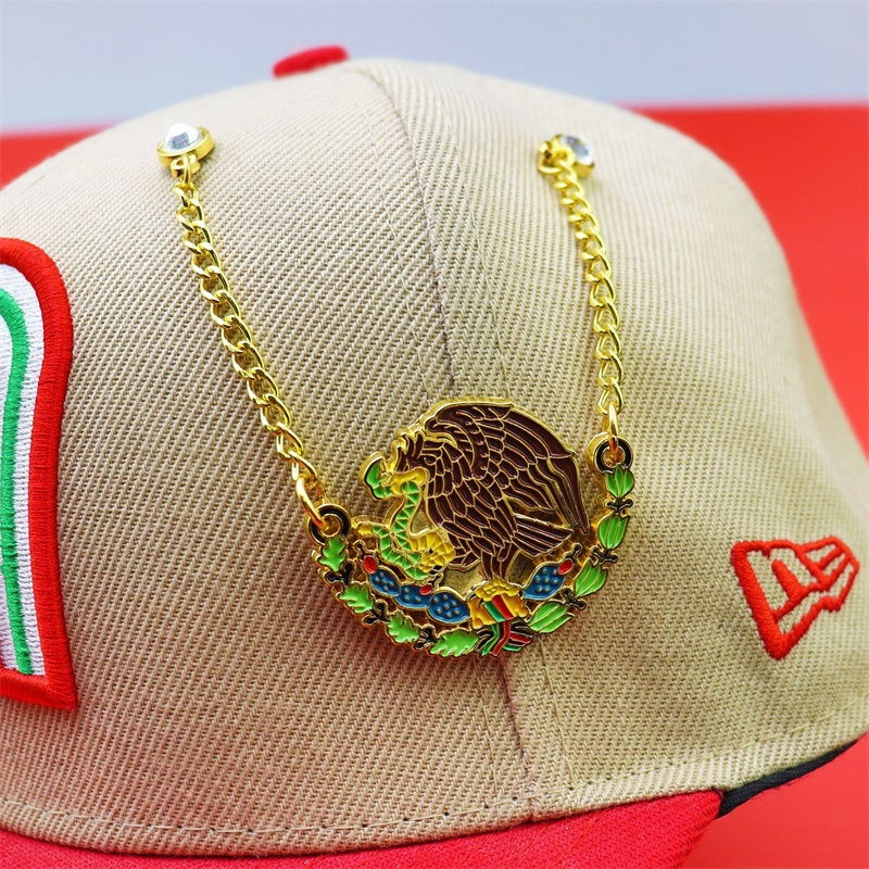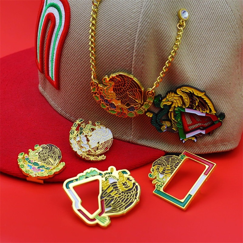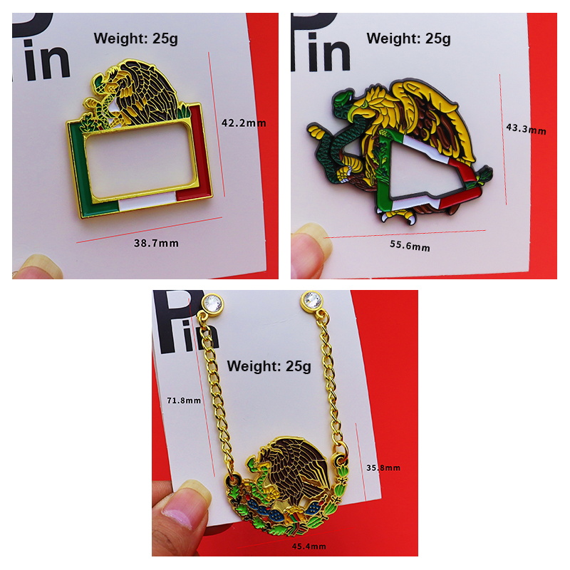 These pieces feature diverse shapes: circular emblems, angular framed outlines, and pendant-style designs—all centered on intricate Mexican eagle motifs. Blending glossy enamel (green/red hues), detailed gold linework, and cultural symbolism, the designs balance bold national flair with eye-catching, varied silhouettes.