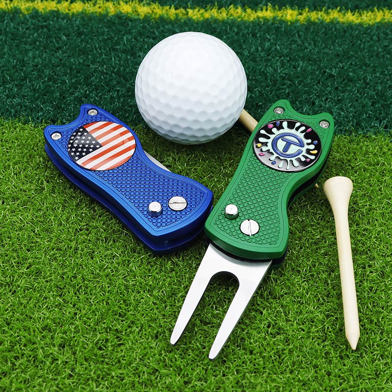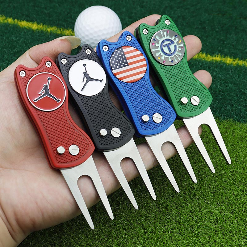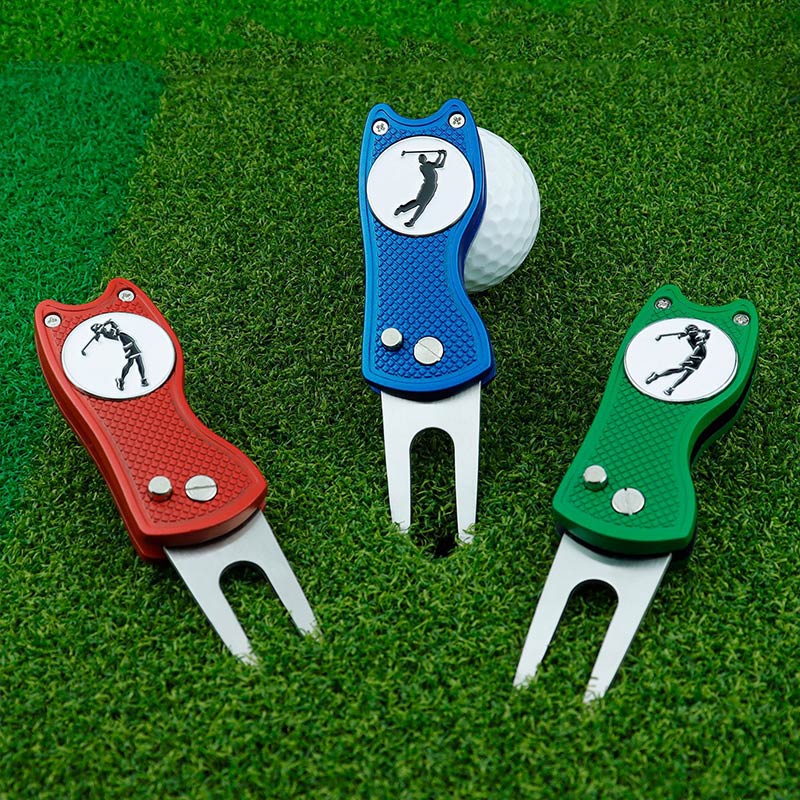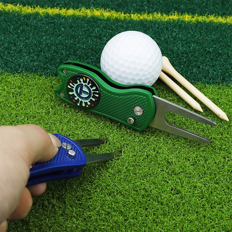This 110g (10.2cm) folding tool (red/black/blue/green) fixes green divots. It features diverse designs (sports icons, flags), textured grip for control, and compact foldable build—merging personalized style with durable on-course functionality, ideal for golfers who value customization and practicality.