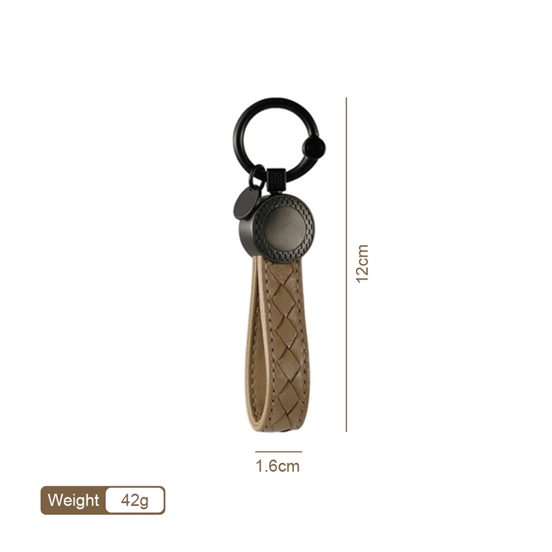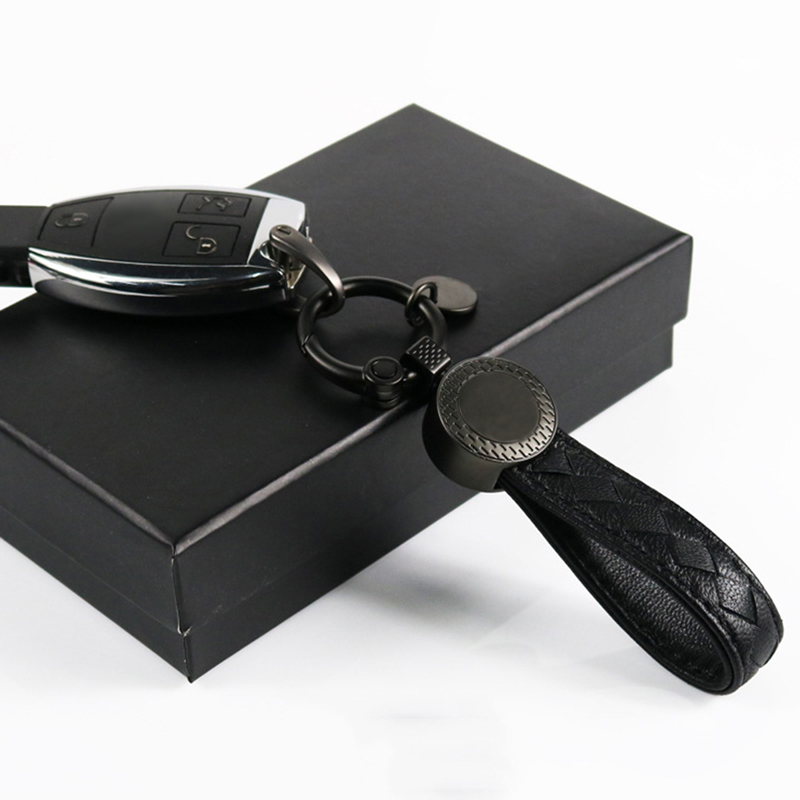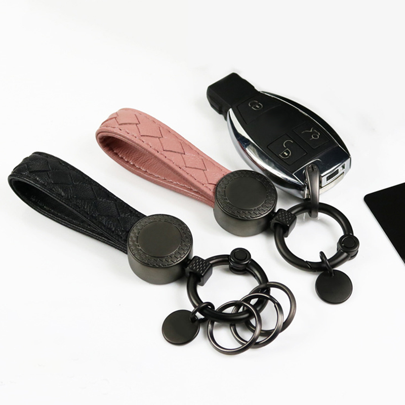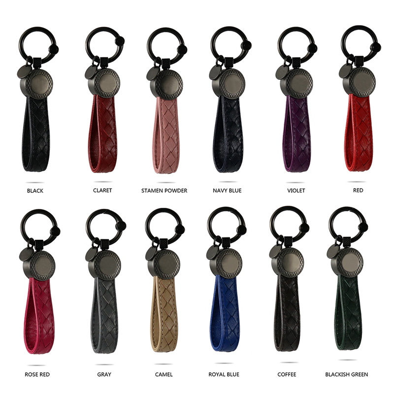 These keychains feature braided leather straps in black, claret, and pink, each with a metal ring and circular logo embellishments. They blend sleek design and craftsmanship, ideal as stylish, customizable accessories.