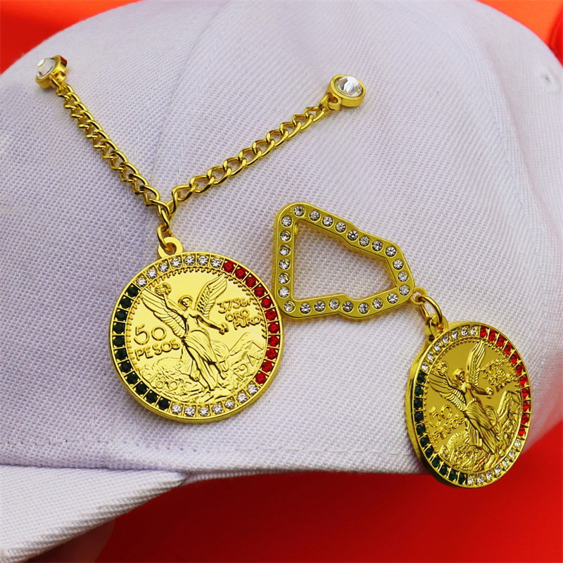 Sparkly Gold Coin Adornment Pins, Featuring diamond-trimmed triangle clasps, gold Olympic coin pendants (with flying figures), and gold chains, this cap decor adds shiny, thematic flair—ideal for Olympic fans craving eye-catching accessory touches.