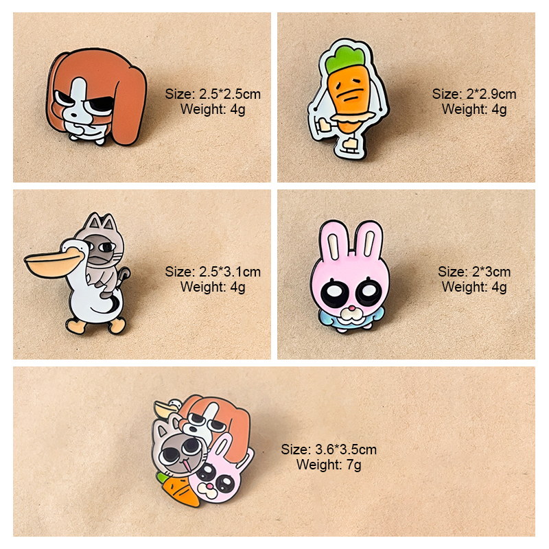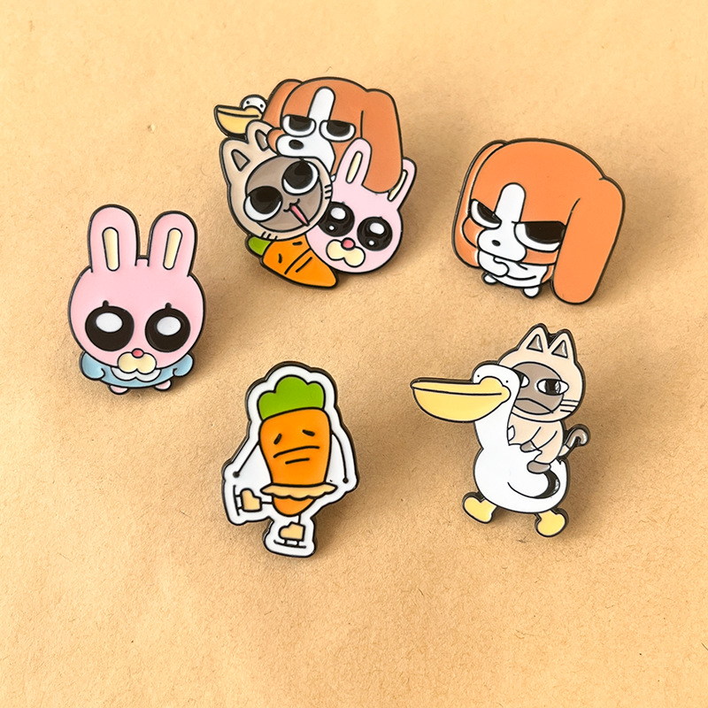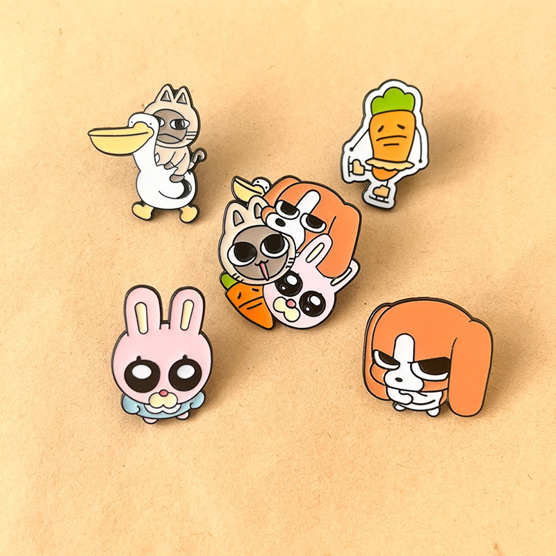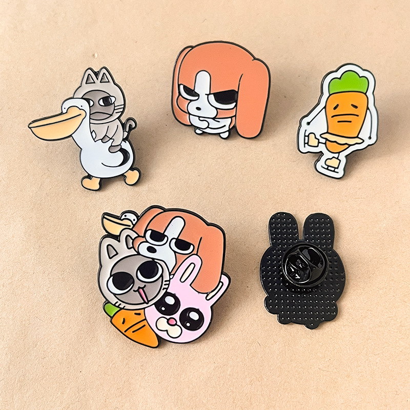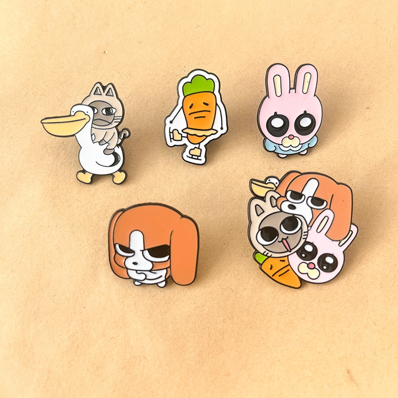 These pins have whimsical, character-shaped silhouettes (cat-pelican combo, grumpy carrot, cuddled group) with bold, glossy enamel. They attach easily to backpack zippers, denim jacket pockets, or hat brims—adding playful, quirky charm to casual daily accessories or fun-themed outfit accents.