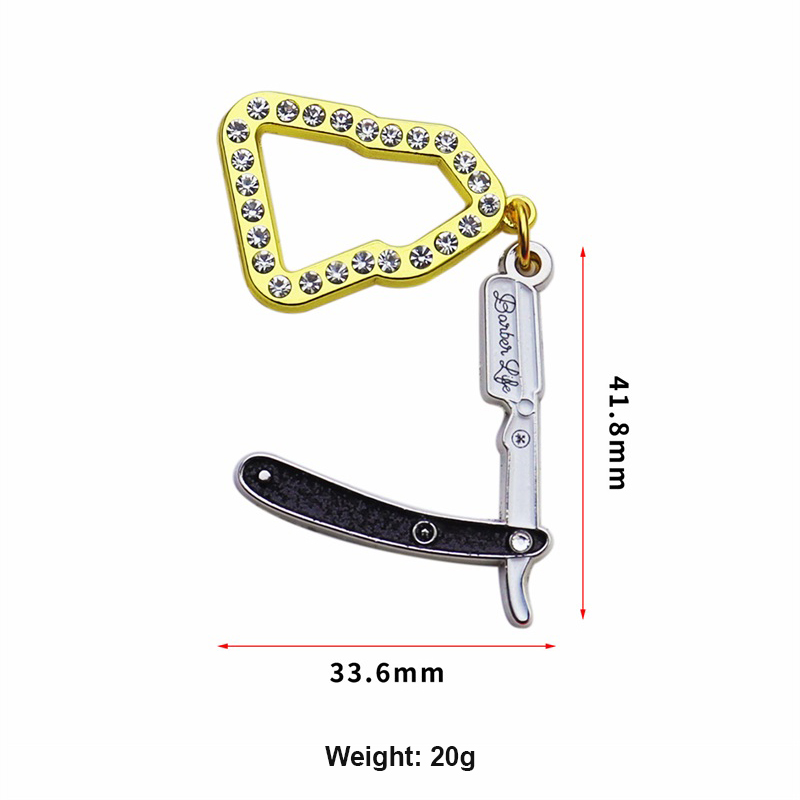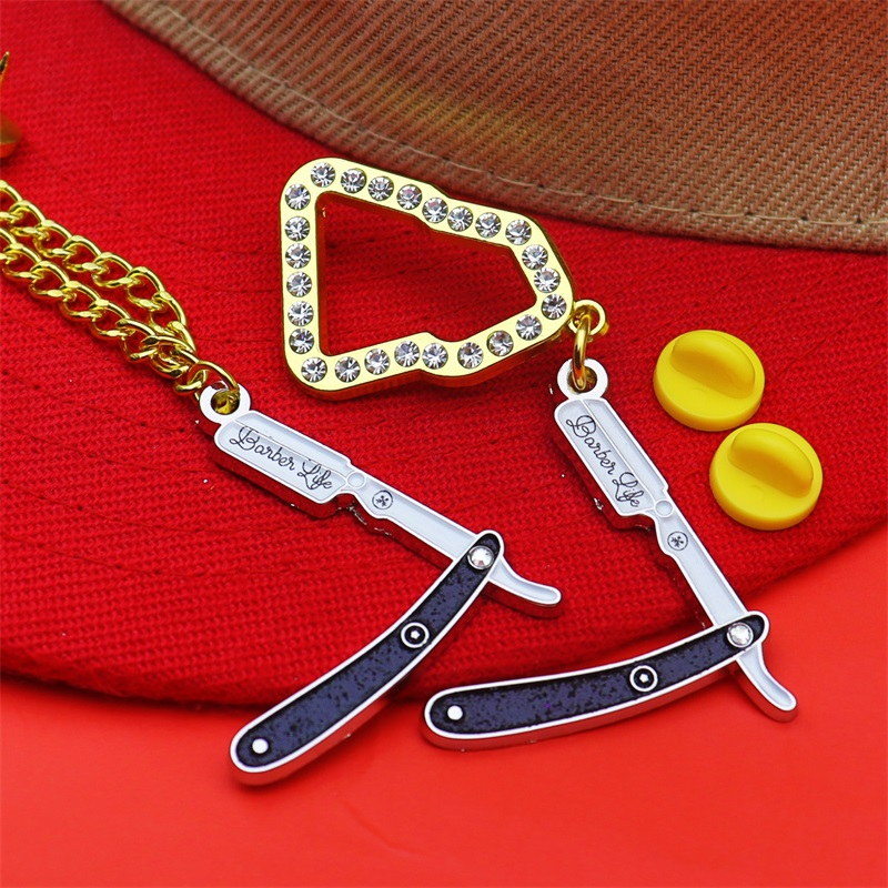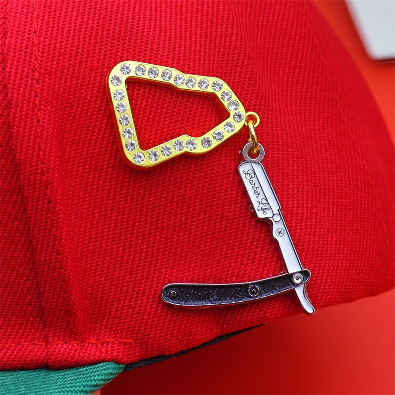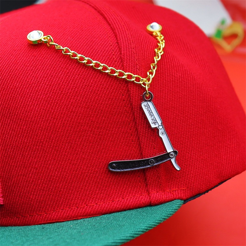 These cap accessories feature razor-shaped pendants (with fine engraved details) paired with gold chains or rhinestone-adorned frames. Made to decorate caps (adding edgy, sparkly charm), they also suit bag adornment—ideal for those craving distinctive, stylish touches to elevate their accessories.