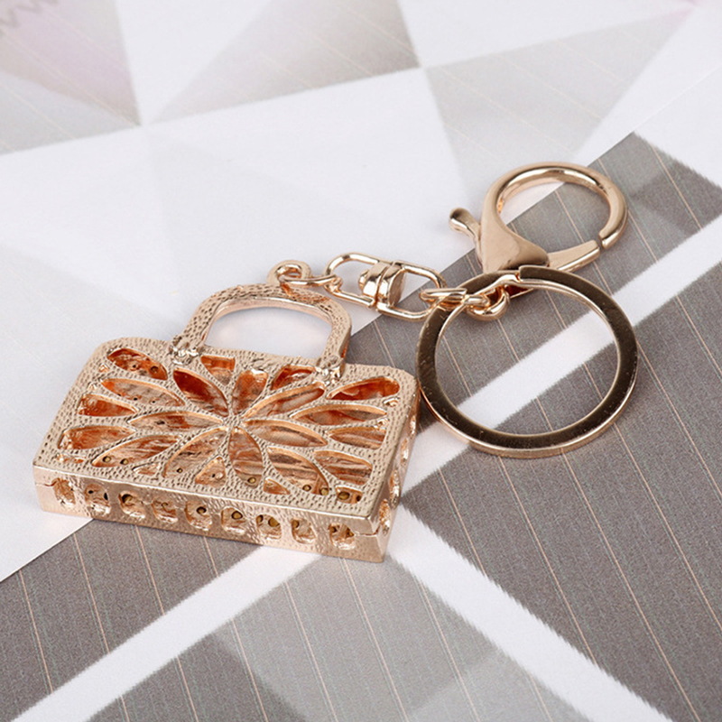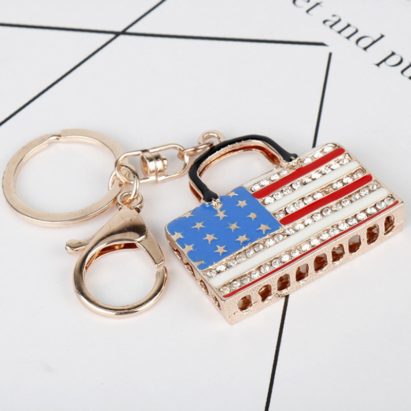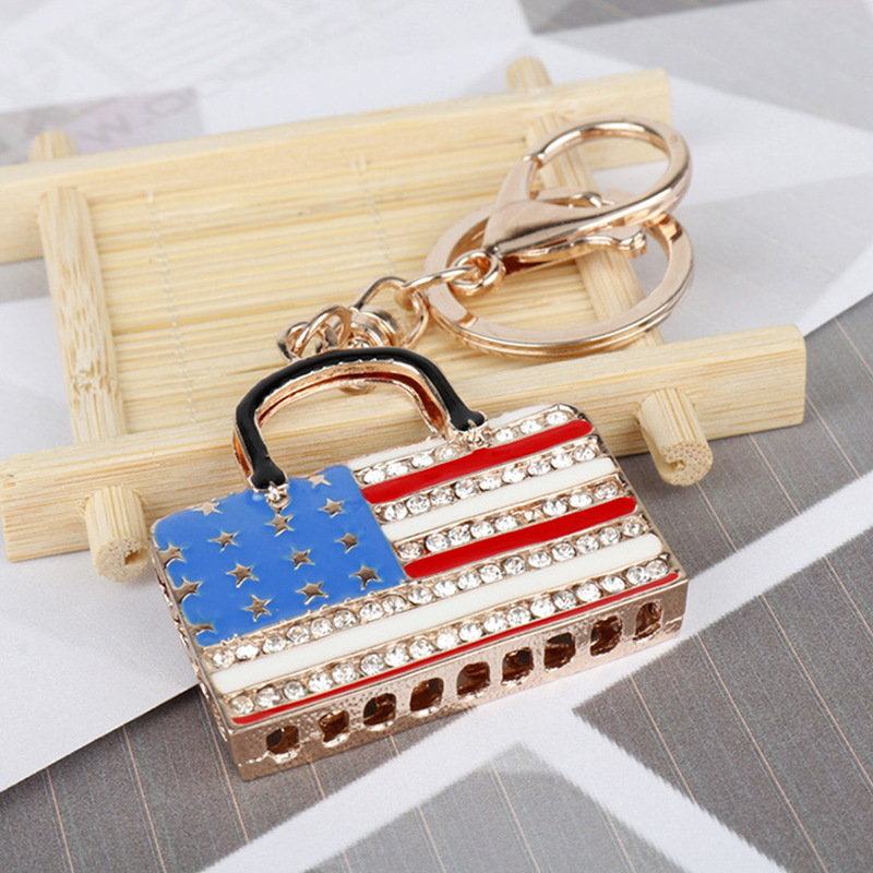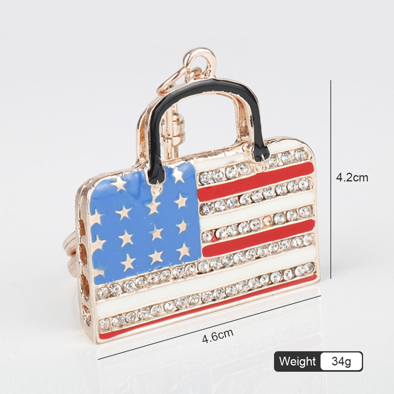 This keychain features an American flag-themed handbag design, studded with rhinestones, in rose gold metal. It comes with a key ring, boasting a glamorous and stylish look, ideal as a trendy accessory.