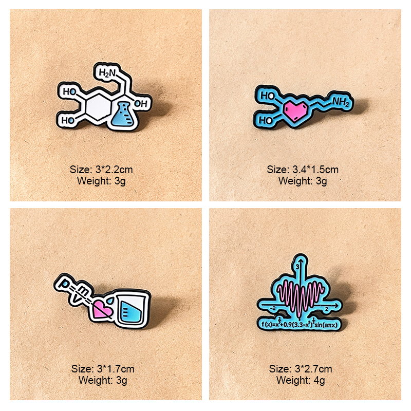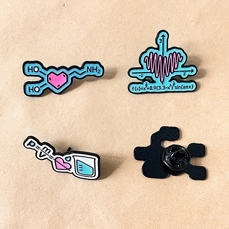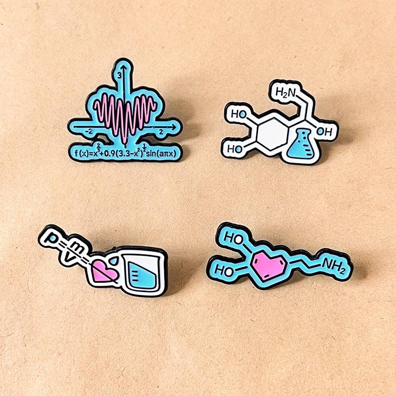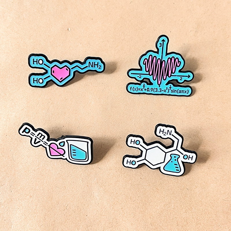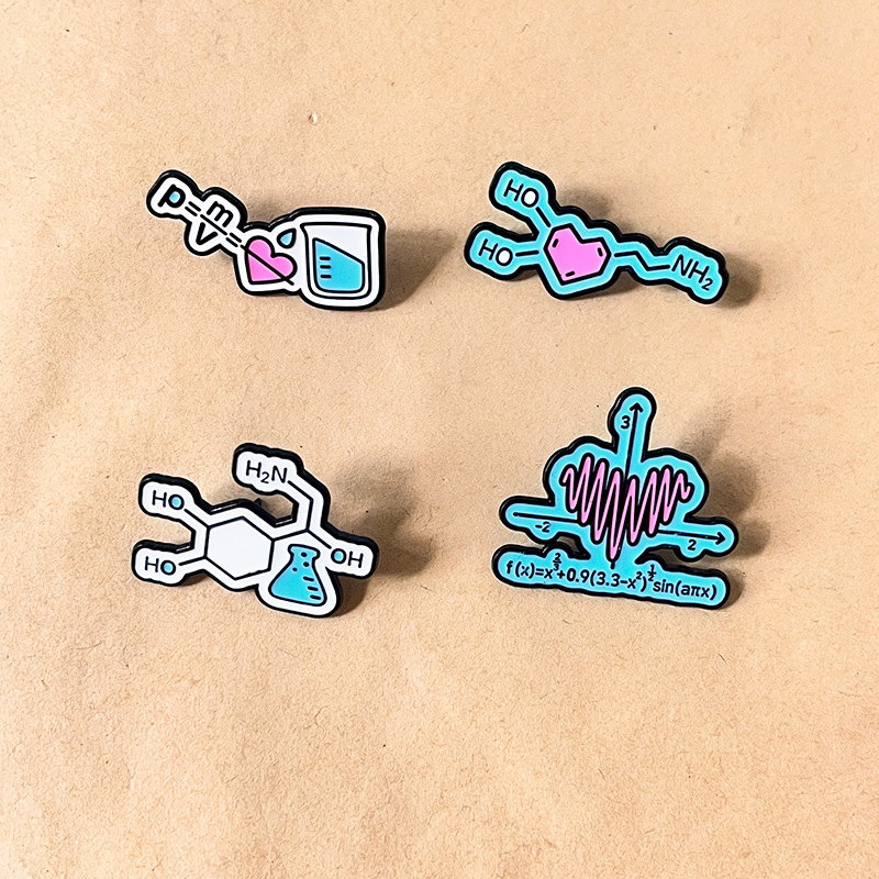 This science & math pin set has glossy enamel designs (math function, chemistry molecule, physics formula, lab gear)—playful nods to STEM. For students/fans, it adds clever, quirky flair to bags/jackets, ideal for campus styling or geeky, academic-themed accessory decor.