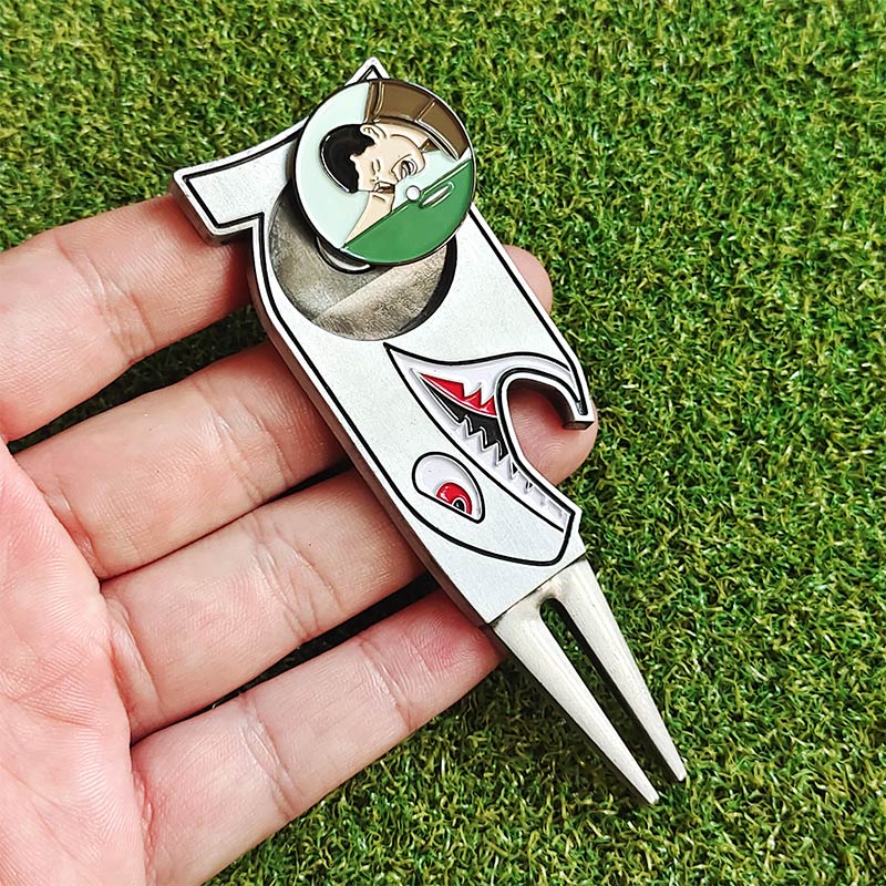 Made of sturdy metal, this divot tool repairs course greens easily. It features a playful character-shark graphic and a removable ball marker, is compact for on-course carry, and adds fun to your game—ideal for golfers or as a quirky gift.
