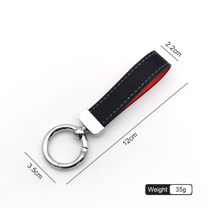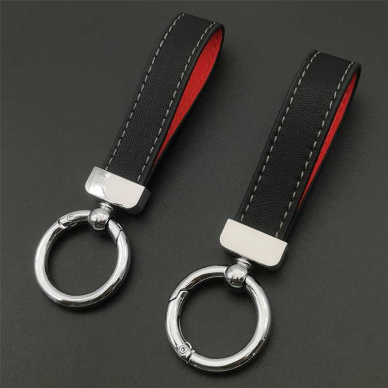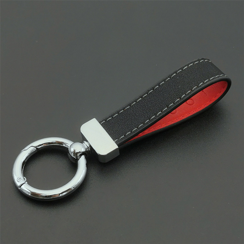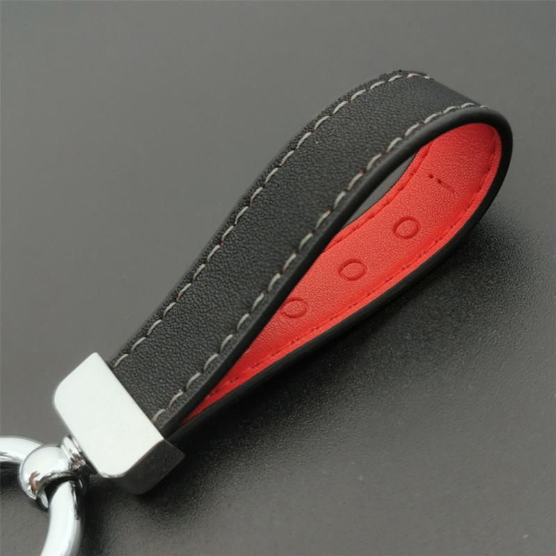 This keychain features a black leather strap with red lining and white stitching, paired with a shiny silver metal ring. It blends sleek design and contrasting colors, making it a stylish and durable accessory.